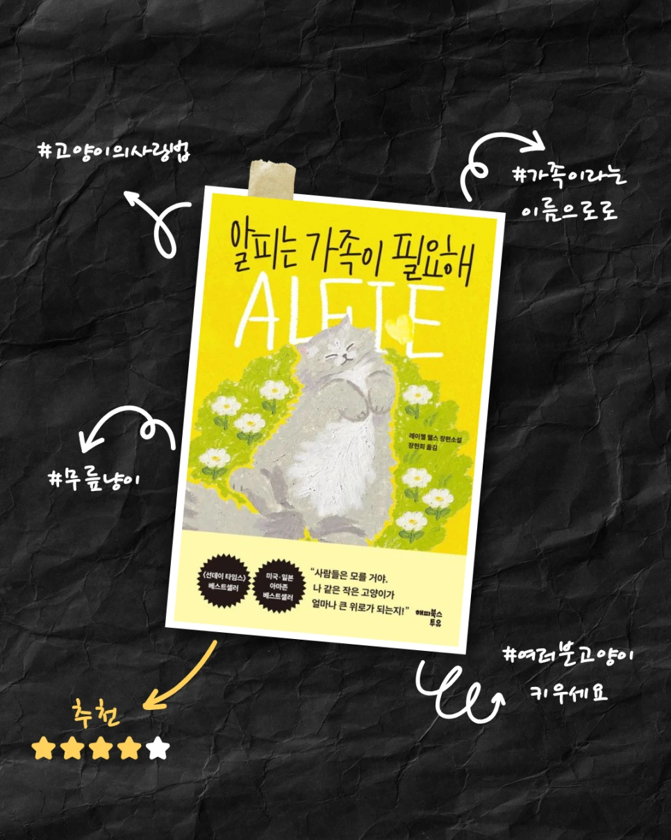 소설은 고양이 이야기로 시작하지만 결국 가족이란 무엇인지를 우리게 묻는다. 혈연을 넘어서 서로를 보듬어 주는 관계, 다정함을 매일같이 연습하는 사람들 그리고 말없이 곁에 있어주는 존재. 그것이 가족이라면 알피는 아니 고양이는 어쩌면 누구보다 먼저 가족의 정의에 도달한 존재일지도 모르겠다.