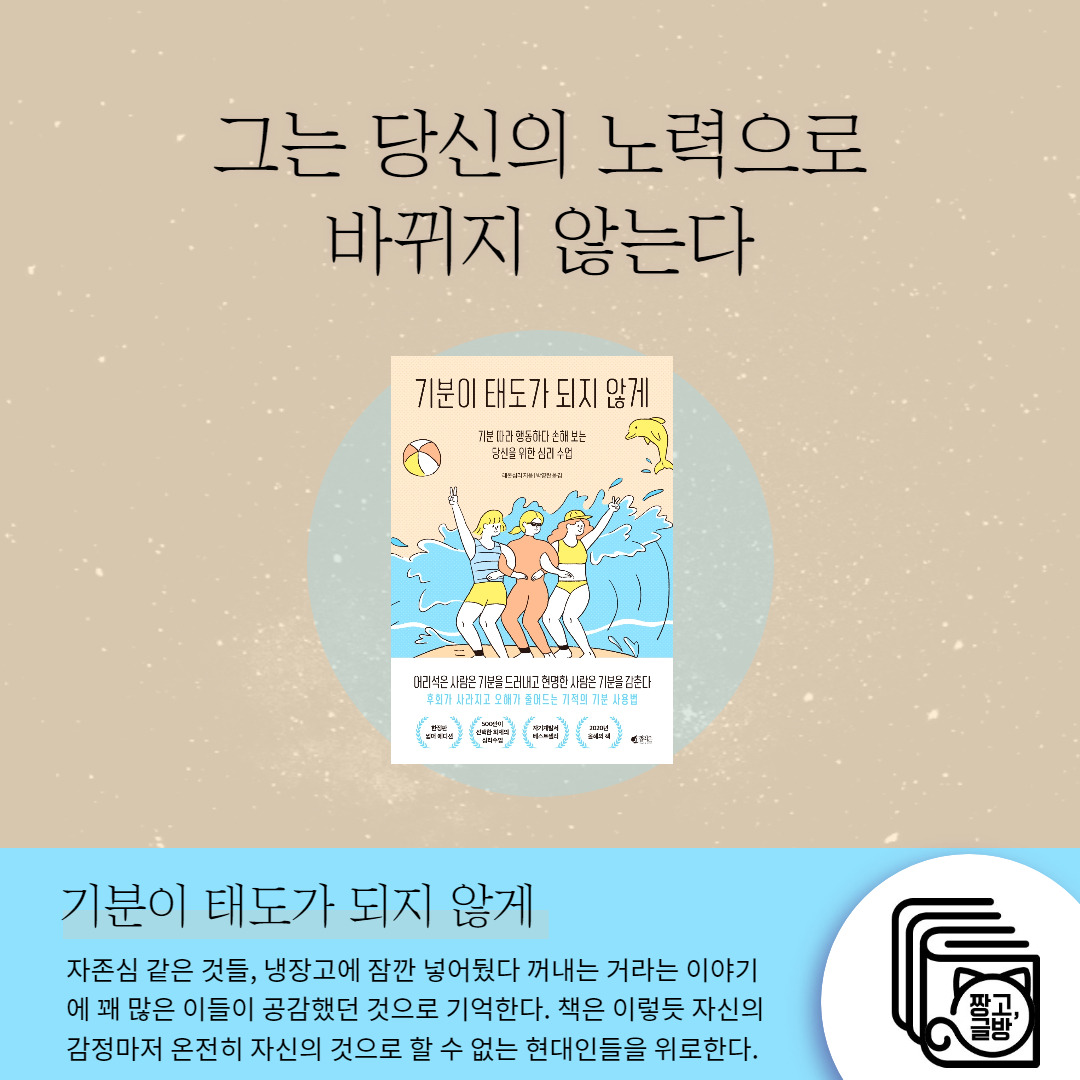 어느 웹툰에서 자존심이나 감정 같은 것들, 냉장고에 잠깐 넣어뒀다 꺼내는 거라고 하는 이야기에 꽤 많은 이들이 공감했던 것으로 기억한다. 책은 이렇듯 자신의 감정마저 온전히 자신의 것으로 할 수 없는 현대인들을 위로한다. 그리고 그 감정이 전부가 아님을, 우리는 그 감정을 벗어나 조금 더 나은 선택을 할 수 있으며 그렇게 앞으로 나아가야 하는 존재임을 다양한 사례를 들어 이야기한다.