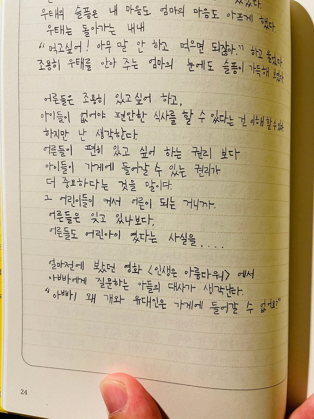 처음에 얘기했듯이 고작 초등학생이란 편견에 `그림이나 유명하지` 정도의 내 생각은 책을 읽는 동안 산산이 깨졌다. 2008년생, 올해로 14살의 아이의 마음이 이토록 깊고 섬세할 줄이야. 책을 읽는 두어 시간 망치로 머리를 세게 얻어맞은 기분이었다.