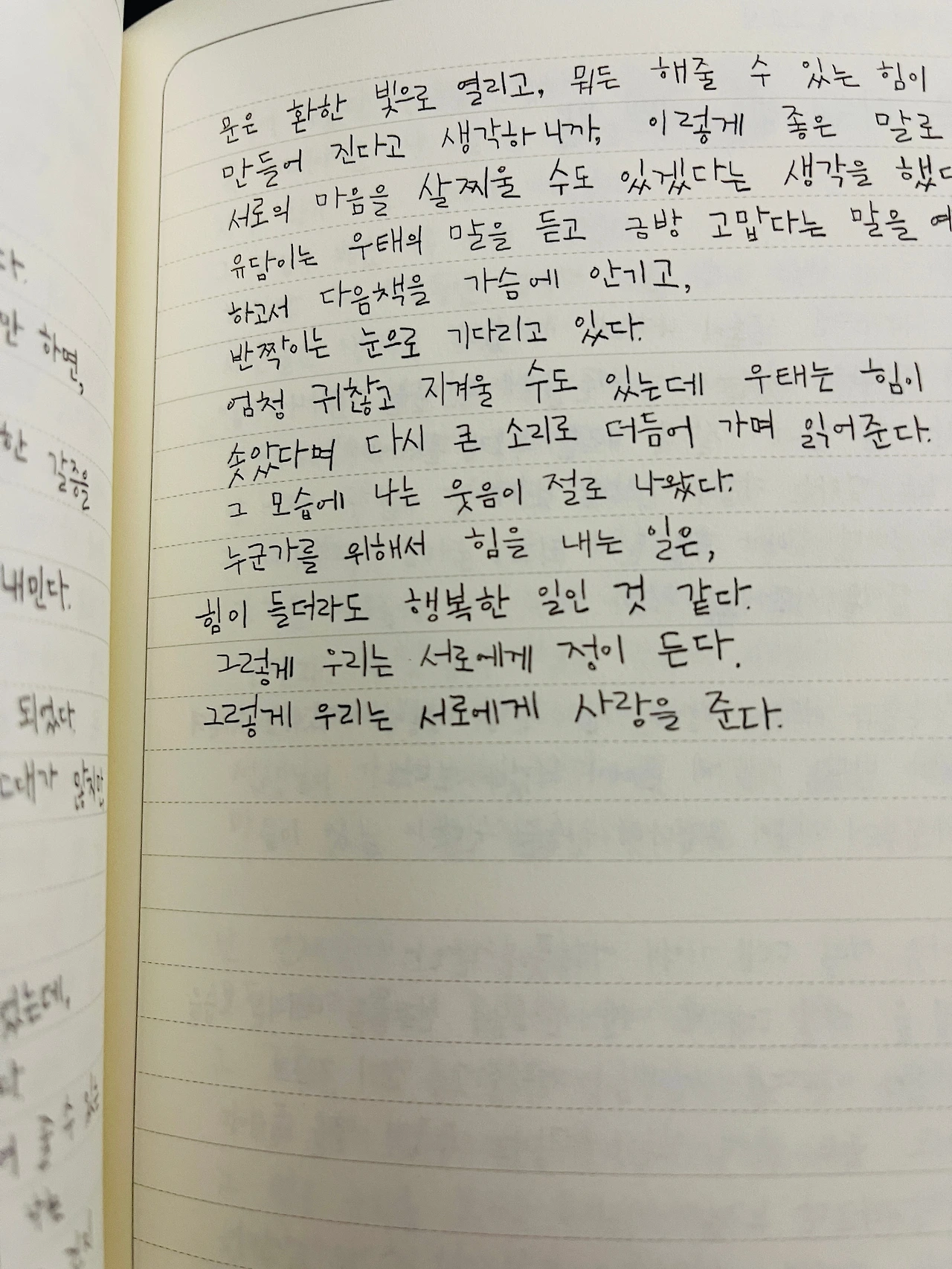 갤러리에 전시된 이수 작가의 그림들을 둘러보았다. 화가로 알고 있던 이수 작가의 모든 그림에는 이수 작가가 적은 그림의 설명들이 함께 적혀 있다. 그림 자체가 주는 울림도 크지만, 이 그림에 관한 이야기를 읽고 나면 그 울림이 배가 된다. 특히 가족과 엄마 대한 이수작가의 마음은 너무 예쁘고 사랑스러워 때때로 눈물이 날 것 같았다. 서툴지만 최선을 다해 사랑을, 그 애틋함을 표현하는 작가님의 마음이 글에 고스란히 느껴져서 그렇게나 한참을 서 있었다. 그리고 이 책은 그 글, 정확히는 이수 작가의 일기를 담은 책이다.