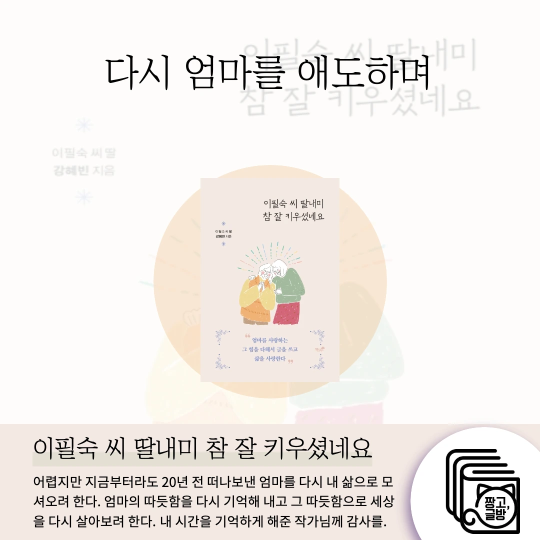 어렵지만 지금부터라도 20년 전 떠나보낸 엄마를 다시 내 삶으로 모셔오려 한다. 엄마의 따듯함을 다시 기억해 내고 그 따듯함으로 세상을 다시 살아보려 한다.