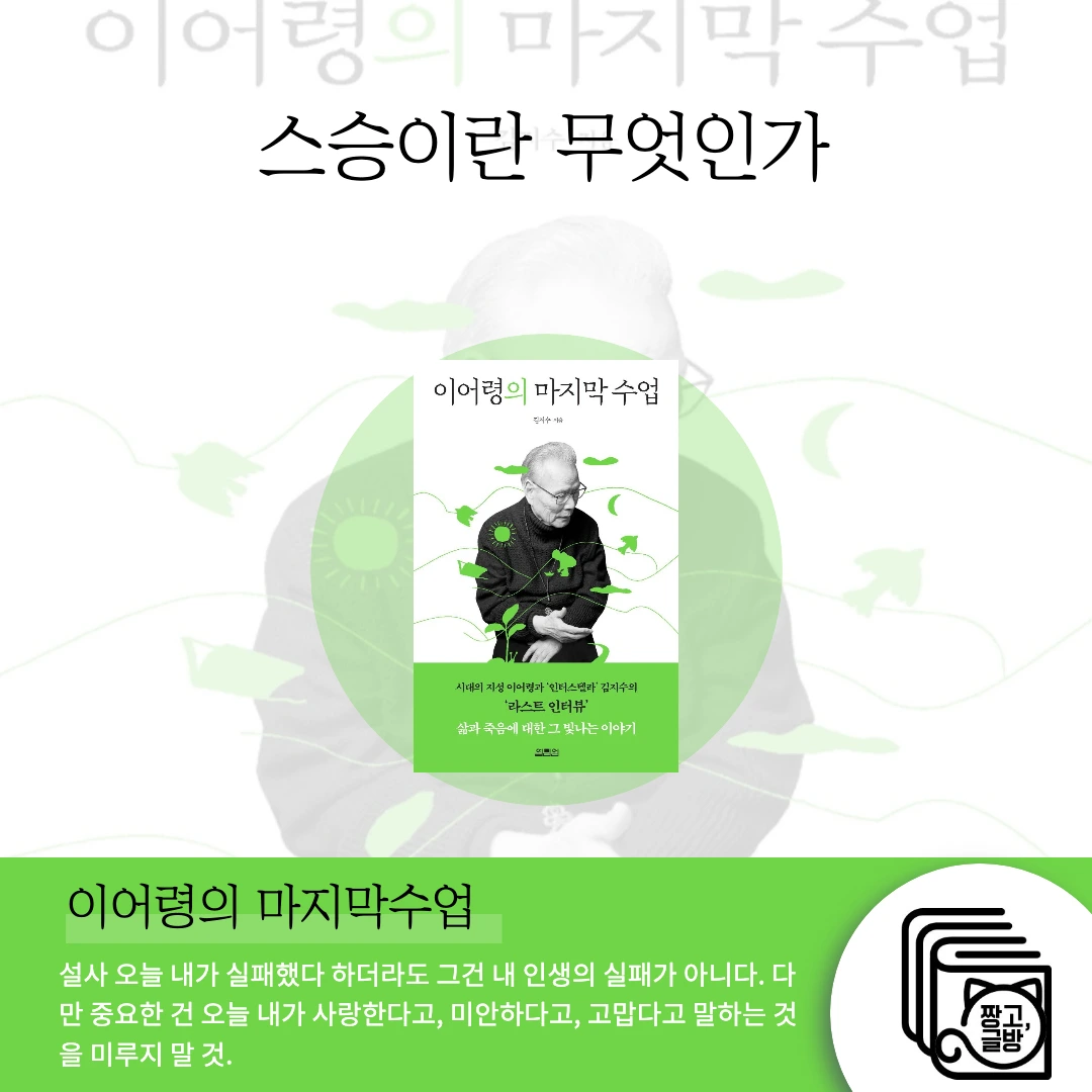 스승이란 무엇인가. 시인 이성복은 스승은 생사를 건네주는 사람이라고 했다. ‘죽음이 무엇인지’를 알려주기 위해 생사를 공부하는 사람이 스승이라고. ‘죽음의 강을 건널 때 겁먹고 급류에 휩쓸리지 않도록 이쪽으로 바지만 걷고 오라’고. 소크라테스가 그랬고 몽테뉴가 그랬고, <모리와 함께한 화요일>의 모리 교수가 그랬다. 멘토나 롤 모델, 레퍼런스가 아니라 정확하게 호명할 수 있는 스승이 곁에 있다면, 우리는 애틋하게 묻고 답하며 이 불가해한 생을 좀 덜 외롭게 건널 수 있지 않을까.(P.6)