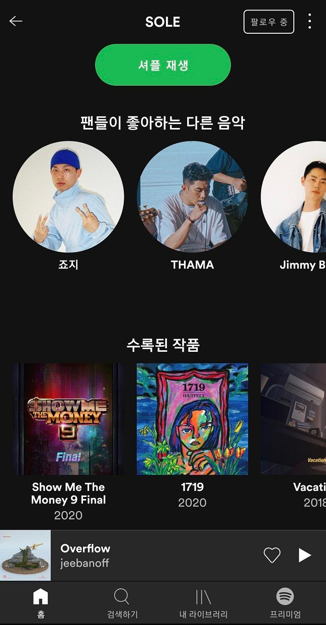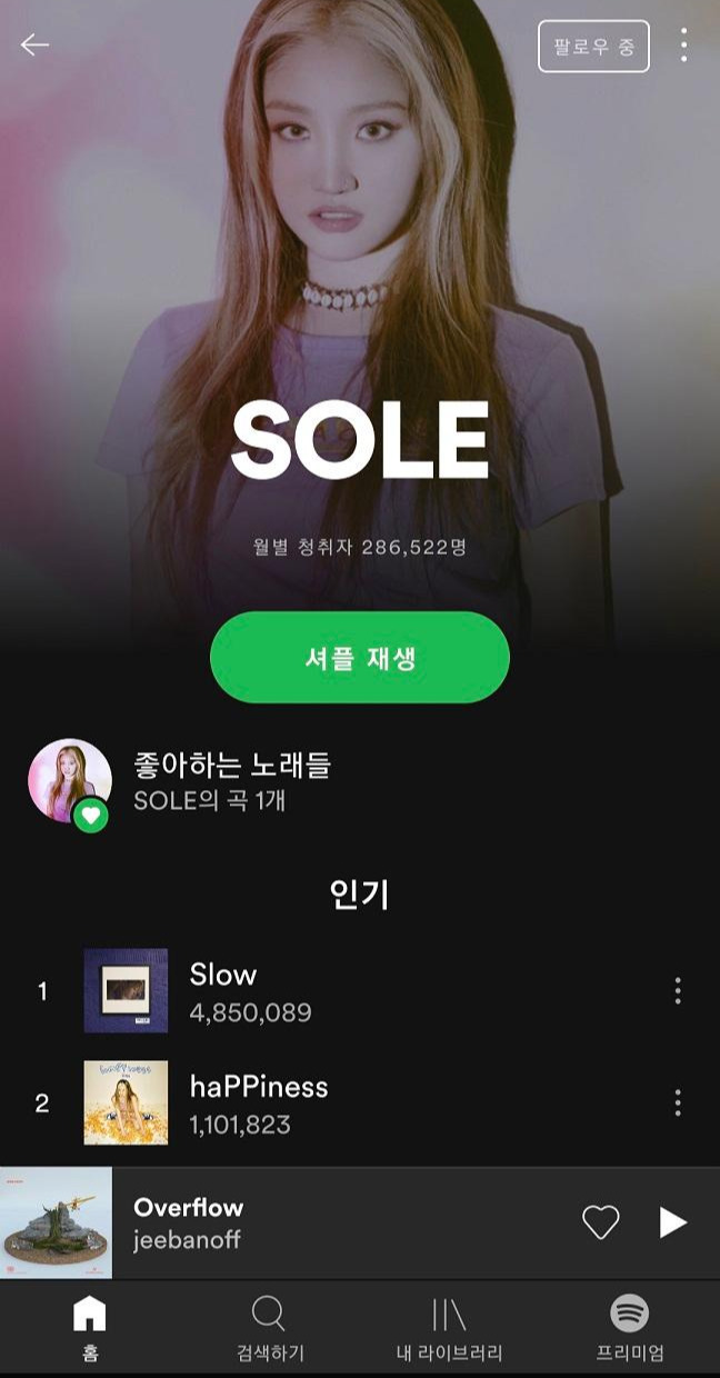 중요한건 추천받은 노래가 정말 내 취향에 맞는 것이여야 할텐데요, 생각보다 추천받은 노래가 좋은 것이 많았습니다. 특히 저는 'SOLE'라는 아티스트를 추천받아 노래를 들어봤는데, 추천받은 노래들이 모두 너무 좋더라고요.
