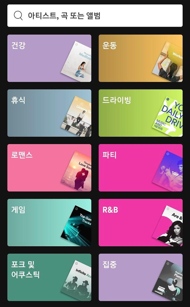 스포티파이의 검색 메뉴는 독특합니다. 검색하기로 들어가면 가요/힙합/R&B 등 장르별 음악 뿐만이 아니라 운동/휴식/드라이빙/파티 등 다양한 상황별로 테마가 구성되어 있어요.