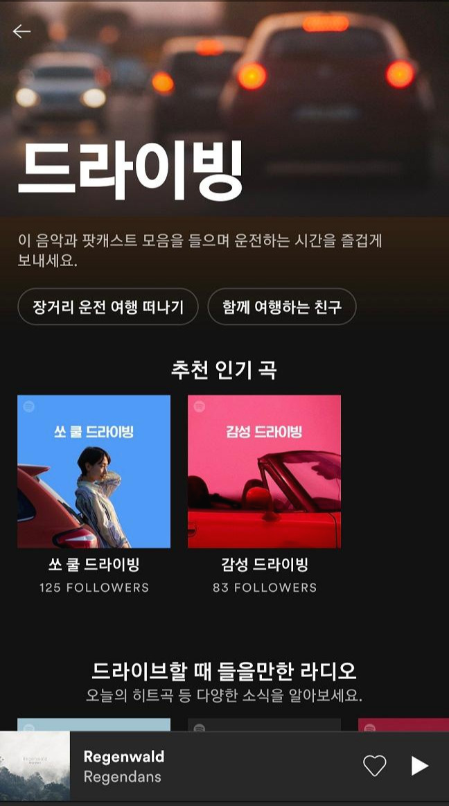 드라이빙 메뉴로 들어가보니, "이 음악을 들으며 운전하는 시간을 즐겁게 보내세요" 라는 문구와 함께 추천곡들을 확인할 수 있습니다. 어떠한 상황에라도, 꼭 맞는 음악과 유저를 연결해 주겠다는 스포티파이의 지향점을 느낄 수 있었습니다.