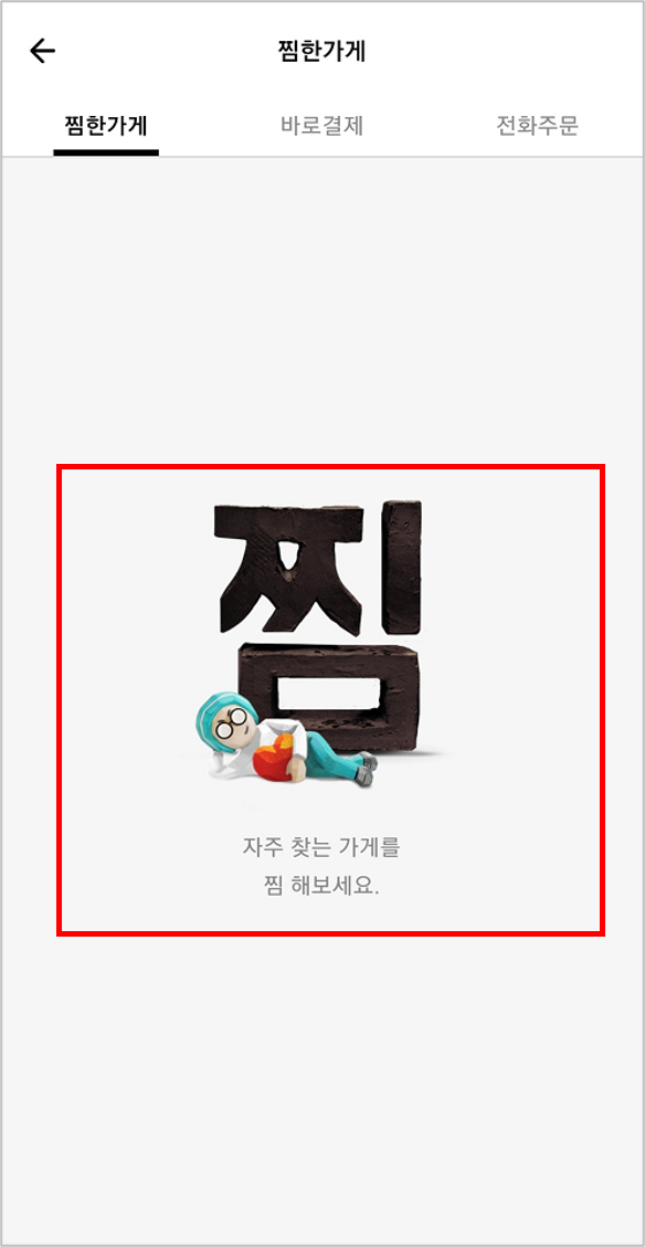 '찜한 가게' 라는 메뉴에서는 배달의민족 전용 폰트로 "찜" 이라는 심플한 텍스트를 ('찜' 음식을 의도한 것인지는 모르겠지만) 보여주고 있고,