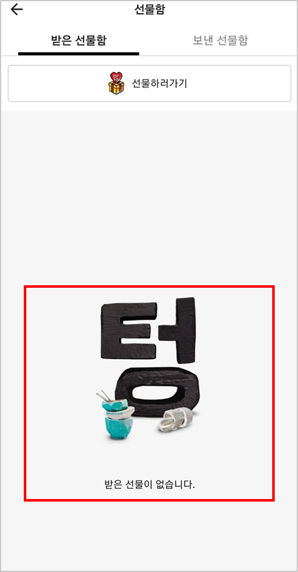 '받은 선물함' 메뉴에서는 선물함이 텅 비었다는 의미로 "텅" 이라는 텍스트를 크게 나타내고 있습니다.