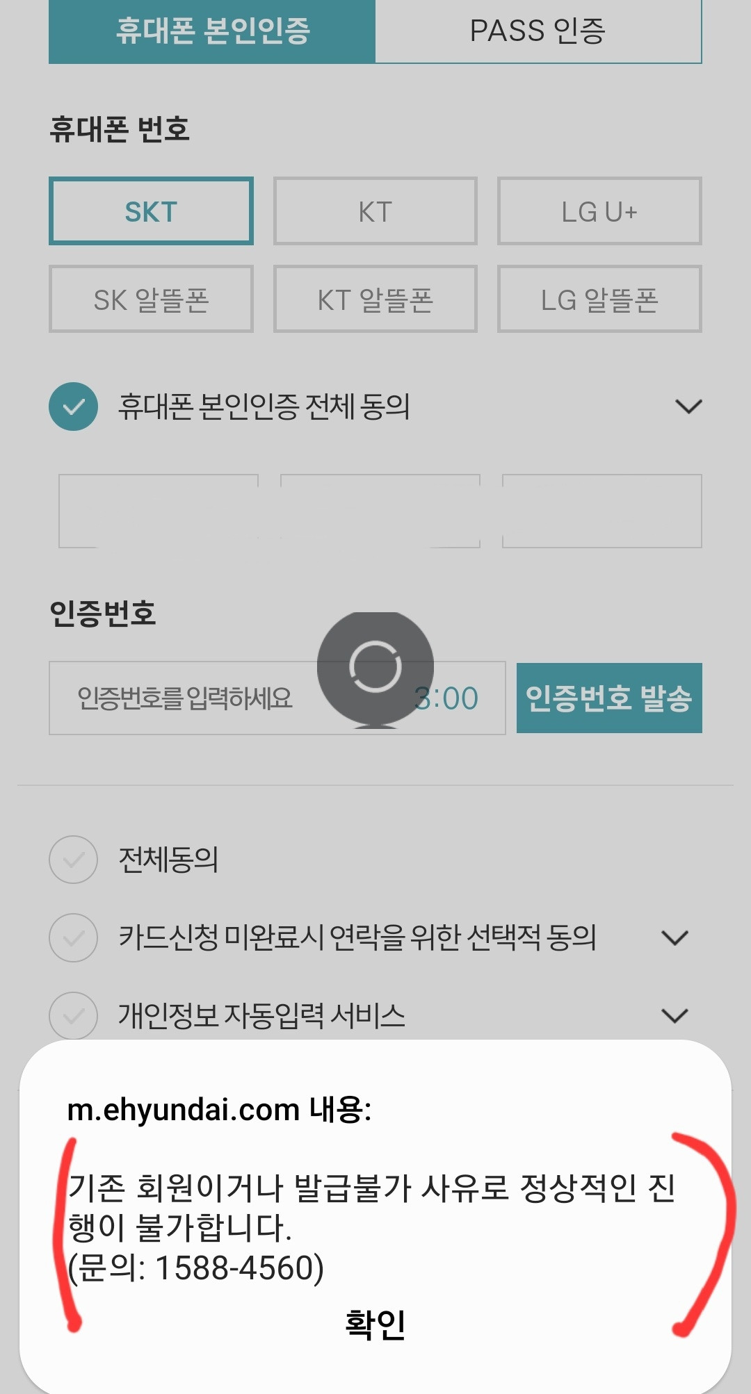 최근에도 현대백화점에서 고가의 물건을 구매할일이 있었는데, 카드가 없다고 생각해서 직원분이 보내준 QR코드를 타고 카드 발급을 진행하다 위와 같은 오류 팝업이 뜨고 진행이 안됐습니다.황당한건 기존 회원이라서 발급이 안되는건지, 뭔가 이유가 있어서 안되는건지를 알 수 없다는 점이에요.