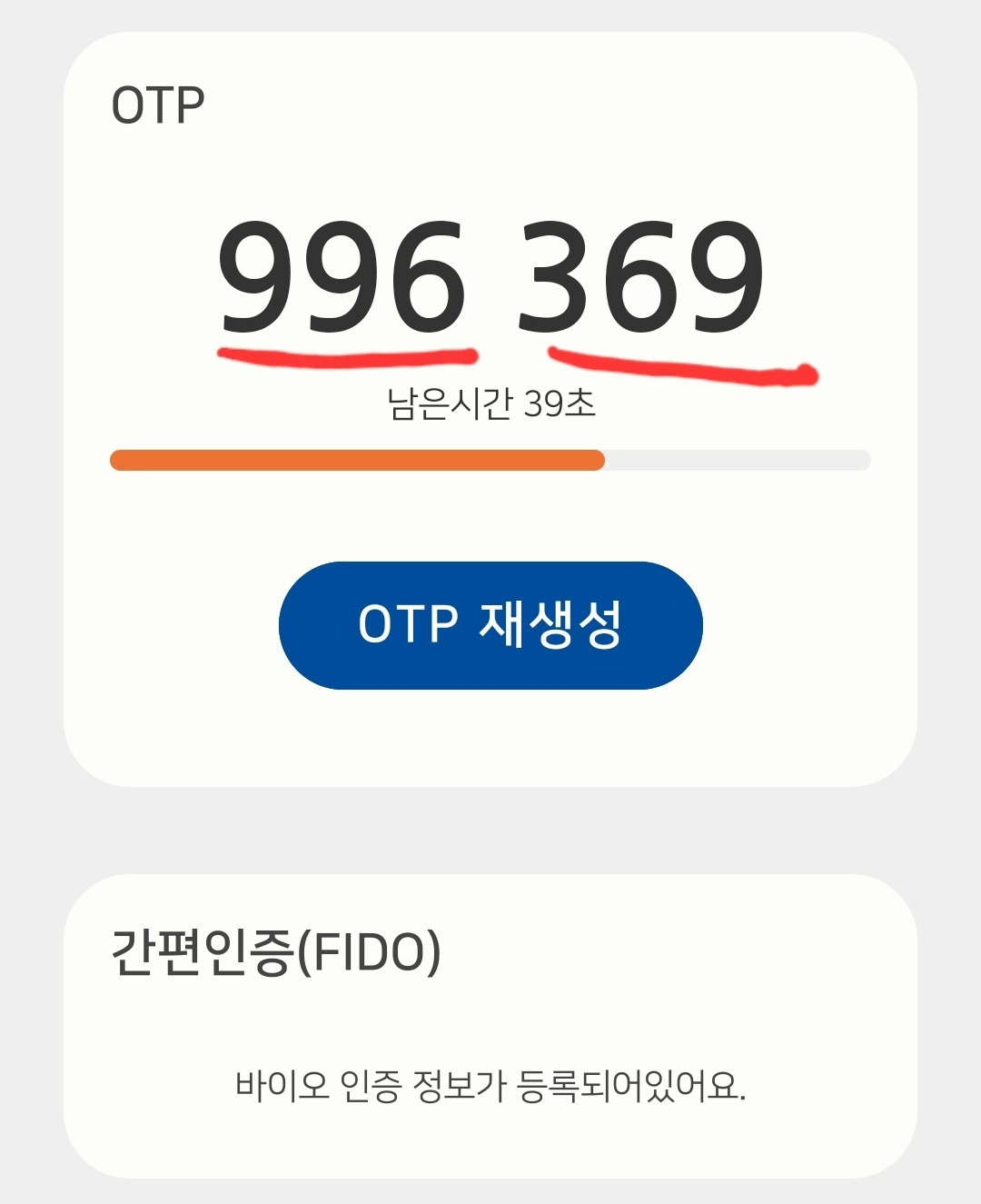 원래는 6자리 번호를 한줄로 보여줬는데(위 예시라면996369), 앱이 개편되면서 3자리씩 끊어서 보여주게 개선됐습니다.