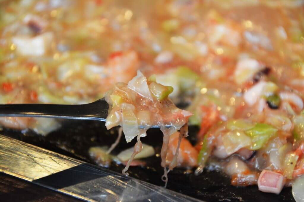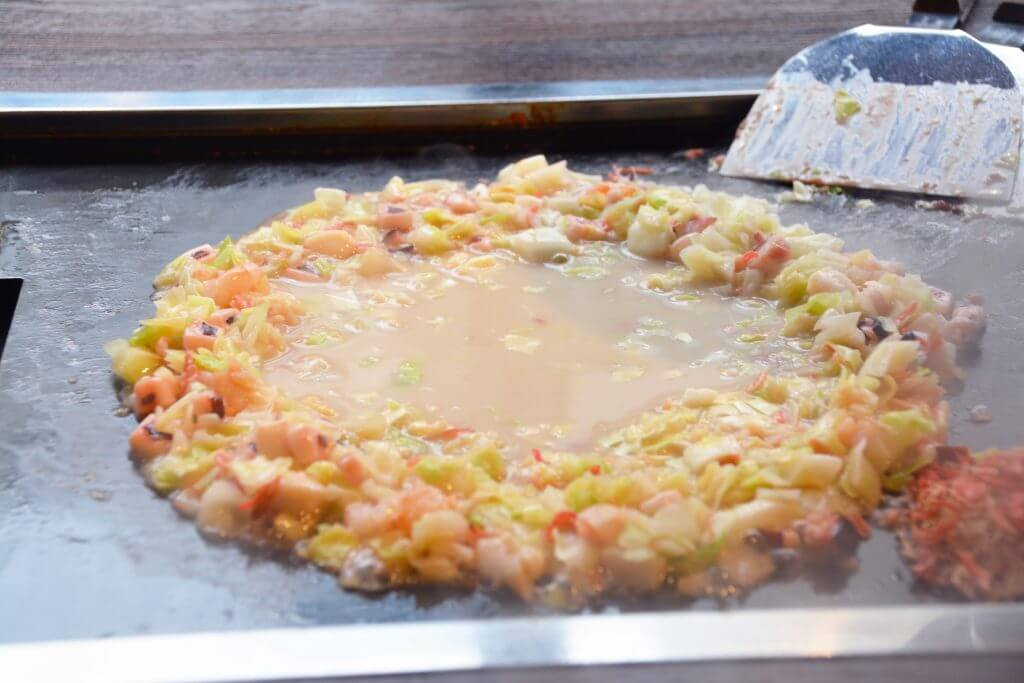 이 음식은 도쿄의 소울푸드인 몬쟈아키에서 출발한다. 이는 전후 식량난으로 못먹고 못살던 시절 밀가루를 물에 풀고 간장과 시럽을 발라 철판에 구워서 먹던 아이들의 간식이였다. 주로 일본의 다가시야(駄菓子屋, 과거 불량과자 등을 팔던 구멍가게 같은 곳)에서 구워서 팔았다. 현재는 밀가루를 물에 풀고 우스터소스등 양념 반죽을 만들어 양배추, 각종 해산물 또는 고기류를 넣어서 철판에 구워 먹는 훌륭한 요리다.