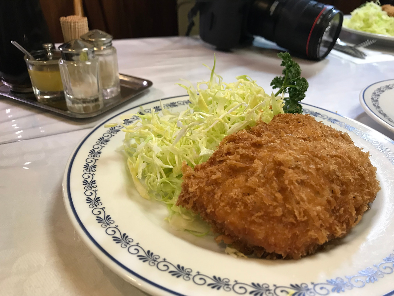 또하나 중요한 것은 돈까스에 빠질수 없는 것이 채썬 양배추다. 그 당시 일본인들은 채소를 절여서 먹거나, 데쳐서 먹는 것이 일반적이였다고한다. 그런데 러일전쟁(1904-1905)때, 젊은 요리사들이 병사로 차출되어 식당에 일손이 부족하게 되었고, 양배추는 하루밤 절여야했기에 손이 많이 갔다고 한다. 그래서 고안한 것이 양배추를 채설기해서 먹어도 되지 않을까하고 테스트를 한 결과, 고객들이 채소를 생으로 먹는 것에 대해 많이 놀라워했지만 의외로 입안이 산뜻해지고 튀긴 메뉴와 궁합이 잘맞다며 정착되었다고 한다.