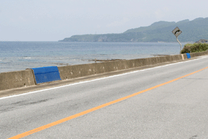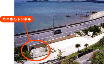 이곳은 オカガニ(오카가니, 한국어로?)와 イワガニ(바위게,Grapsoidea)가 많이 서식한다. 5월하순부터 10월 산란시기에 교통사고가 많이 일어나기 때문에 터널을 만들고 횡단수로를 만들었다. 바다로 돌아갈 때 무사히 돌아갈수 있도록 경사지게 만들고 에코패널도 설치했다. 방파제는 참게가 집게로 집을수가 없어서 그물을 설치해 쉽게 올라갈수 있도록 해놓았다.