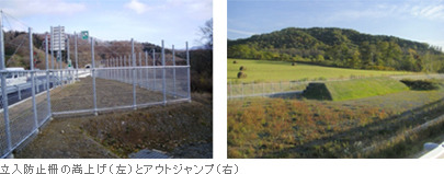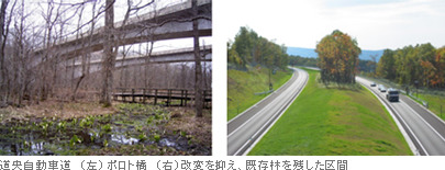 홋카이도의 경우, 습지식물인 물파초 생육을 보전하기 위해 습지에 교량을 설치했다. 긴 다리기 때문에 중간에 교각을 세울 계획이였지만, 물파초 생육환경에 피해가 일어날 것을 고려하여 교각을 세우지 않는 구조로 건설했다. 사슴이 많아 아웃점프라는 토양의 대를 설치하고 만일 출입방지벽을 뛰어 넘어 고속도로 부근에 침입하여도 쉽게 돌아갈수 있는 탈출 지원책을 마련했다.