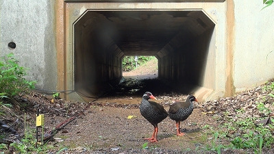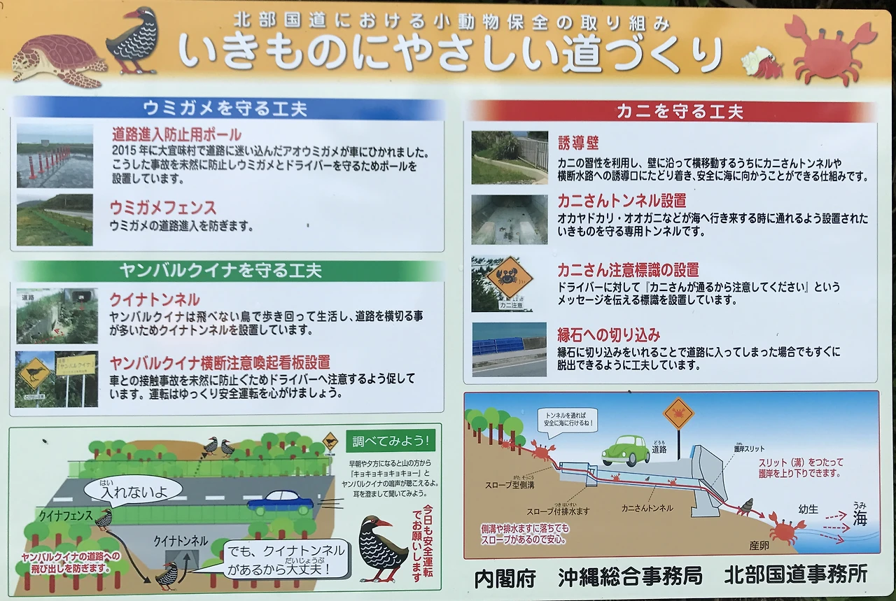 1981년 신종으로 발견된, "흰눈썸뜸부기". 오키나와 북부에만 서식하는데, 이 새는 날지 못한다고 한다. 그러다보니 어미새가 먹이를 찾아 동분서주하다 교통사고로 많은 개체수가 목숨을 잃는다고 한다. 자동차뿐만 아니라 고양이나 야생동물에 의해서도 피해를 입는다고 한다. 이곳에서는 흰눈썸뜸부기가 잘 타나나는 도로에 진입방지책으로 울타리를 만들고 도로 아래에 횡단도로도 만들어 줬다.