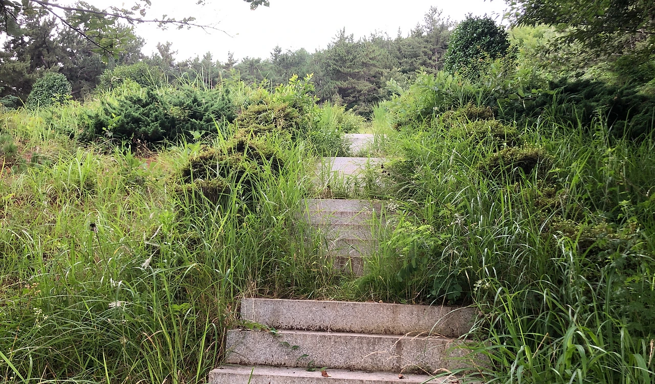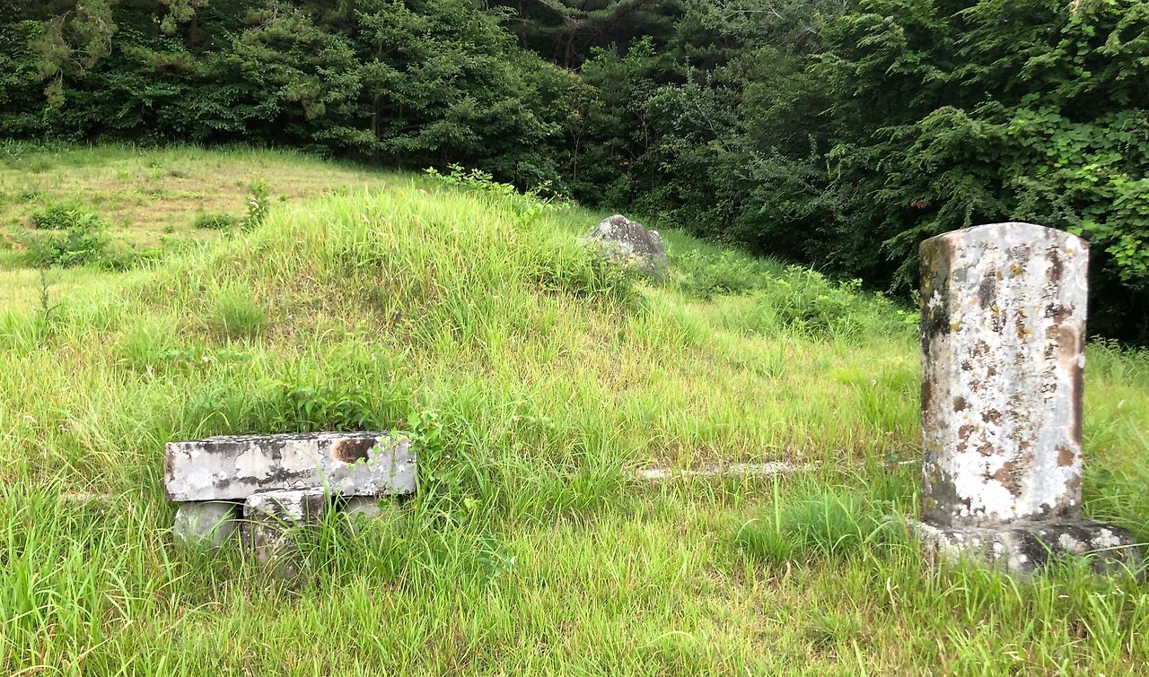 좁은 수풀로 이어지던 나지막한 오르막은 어느 문중의 잘 가꾸어진 넓은 묘소 옆을 지나가는데, 묘소를 지나면 넓은 산길로 바뀌면서 평탄해진다. (1:10, 4.4km)