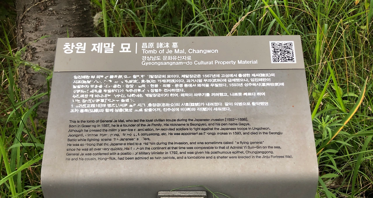 제말 장군 묘에 도착해서 묘를 둘러보았다. 처음 들어보는 장군의 이름. 자료를 찾아보니 임진왜란의 의병장이고, 고성 출신으로 제씨(諸氏)의 시조라고 한다. (0:40, 2.5km)