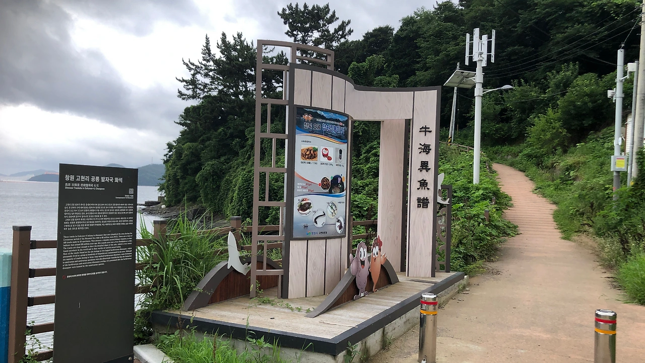 개구리산을 돌아 나오면 진동물재생센터가 있고 다시 길은 바닷가로 와서 짧은 숲길로 이어지는데, 입구에 고현의 공룡 발자국 화석이 있다는 유적지 안내판이 있다. 그 옆의 '우해이어보'라는 안내판에서는 어종 안내를 하고 있다. '우해(牛海)'라는 것은 진해 앞바다를 이르고, '우산(牛山)'은 진해를 이르는 말이라고 한다. (3:05, 12.0km)