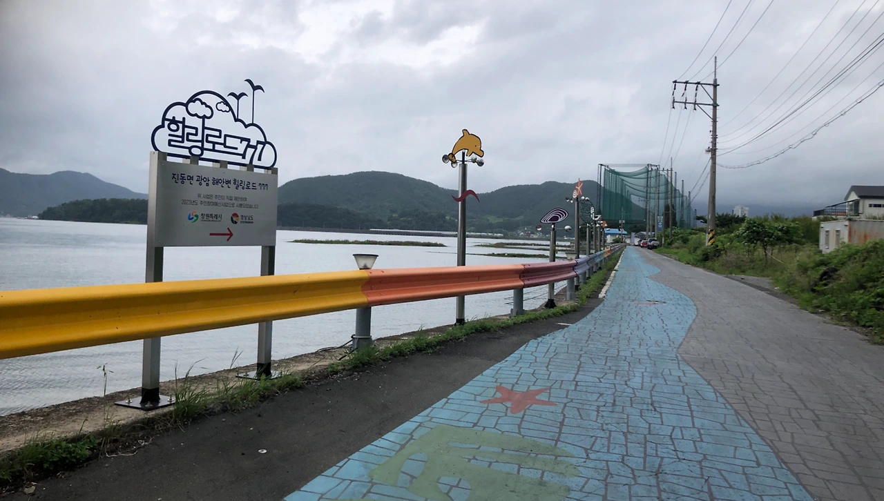 광암항에서 광암마을 방향으로 잠시 걷다 보면 왼편으로 이어지는 바닷가길이 나온다. '힐링로드 777'이라는 이름의 광암 해안길이다. 힐링로드라고 해서 특별한 것이 있는 것은 아니고, 그냥 조용한 해안가 도로인 것과 주민제안사업으로 지원을 받은 듯, 약간의 디자인 요소가 가미된 설치물들이 있는 정도이다. (2:05, 7.7km)