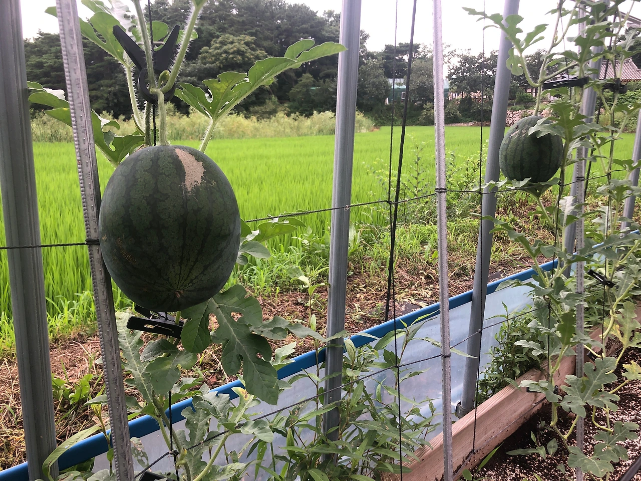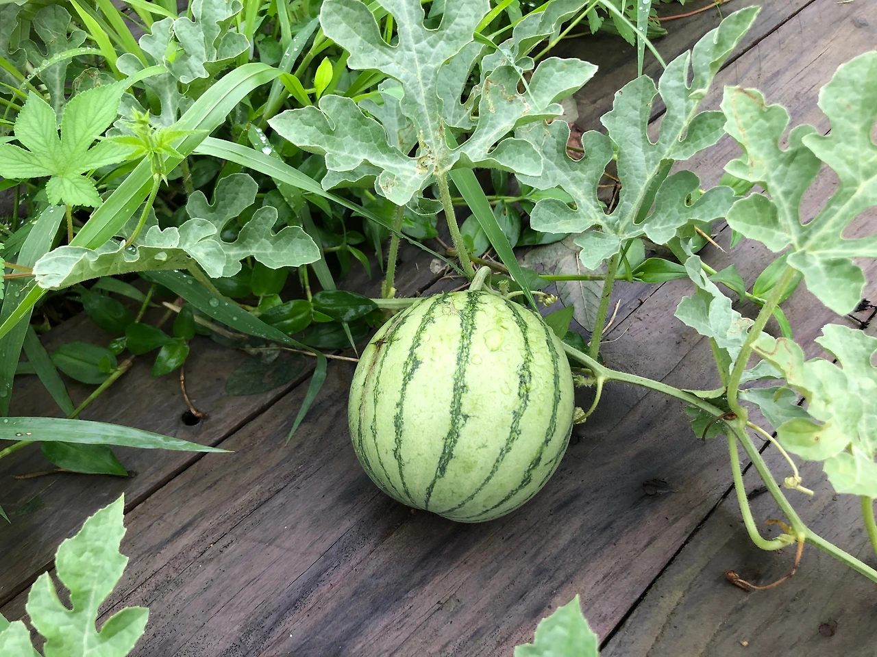 비닐하우스 안에서는 망고수박이 자라고 있는데, 이것도 어쩐 일인지 한 줄기에 하나도 아닌, 한 주에 하나 정도밖에 착과를 하지 않고 있다. 장마 때문에 벌들이 수정을 못해줘서 그런 건지도 모르겠다 싶어서 우선 기다려본다. 딸랑 두 개 맺힌 열매가 벌써 수확을 해야 될 정도로 커졌는데 첫 번째로 착과한 것은 모양새가 삐딱하다. 이건 왜 그런 걸까...