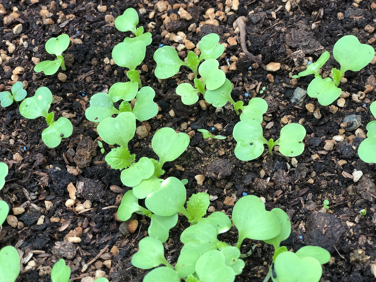 엇갈이도 무와 마찬가지로 발아가 잘 된다. 뿌린 대로 잘 거두려면 우선 발아부터 잘 되어야 하는데 그 느낌을 가장 잘 안겨주는 푸성귀가 엇갈이배추인 것 같다. 작년에는 다른 것들이 많아서 뿌려놓고도 제대로 솎지를 않아서 웃자라버린 것들이 많았는데, 올해는 관심을 더 기울일 수 있는 시간이 되지 않을까 싶다. 파종한 지 4일 만에 와글와글 발아했고, 1주일 정도 지나니 본잎이 보이기 시작할 정도로 성장이 빠르다.