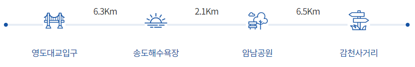 중구관광안내소 - 엔터테이너 거리 - 용두산공원 - 부산근현대역사관 - 보수동책방골목 - 부평깡통시장 - 족발골목 - BIFF 광장 - 자갈치시장 - 충무동새벽시장 - 송도해상케이블카탑승장 - 송도거북섬(X) - 송도해수욕장 - 송도오션파크 - 뉴질랜드 한국전 참전 기념석 - 암남공원 정문 - 송도용궁구름다리(X) - 구름다리 - 포구나무쉼터 - 기억나무 - 두도전망대 - 암남공원 후문 - 임도 - 부산 서구 에코센터 - 팽나무공원 - 감천나누리파크