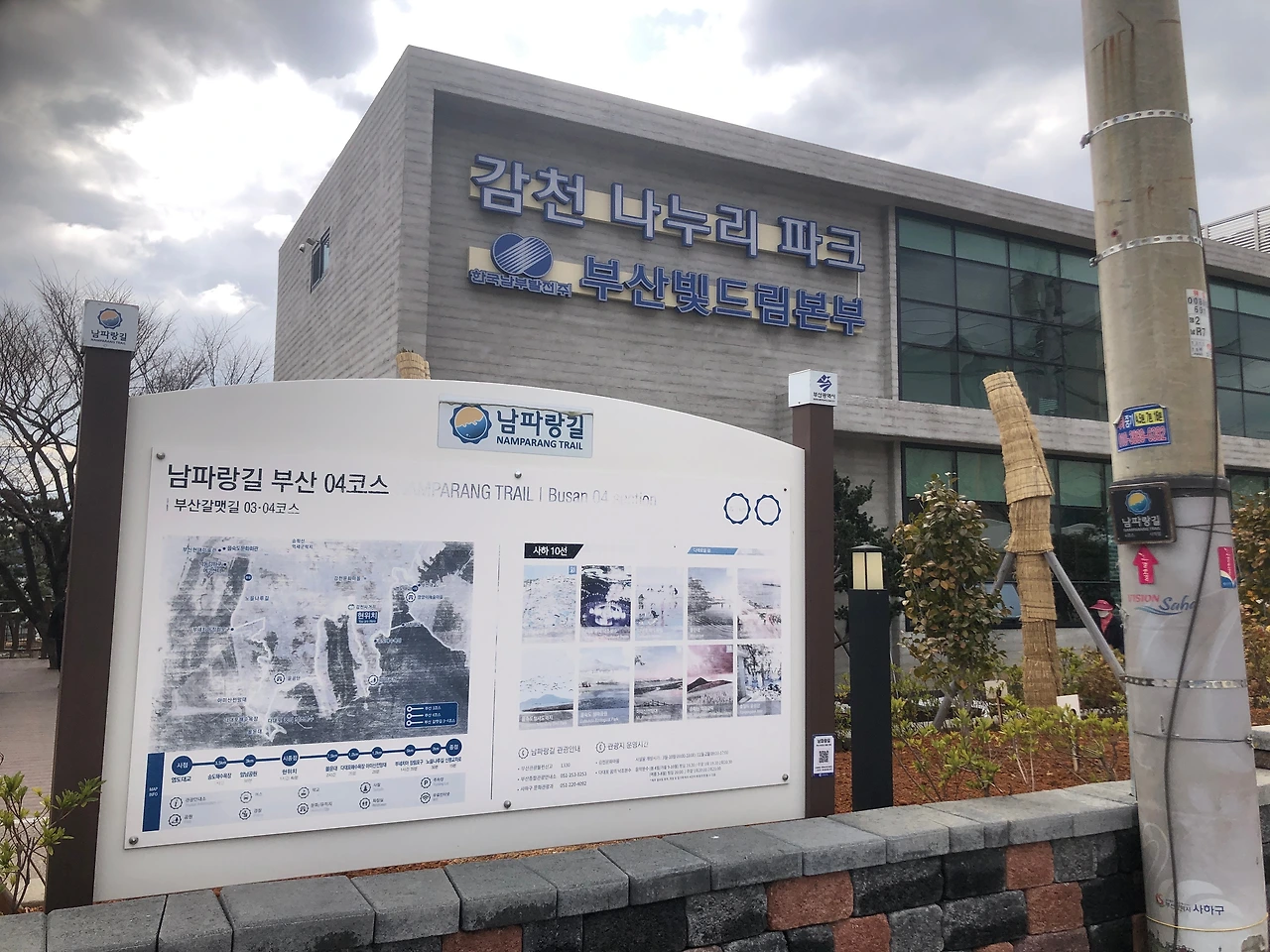 종점인 감천사거리에 있는 감천나누리파크에 도착했다(17.0km, 14:00). 안내판은 잘 보이는 위치에 자리 잡고 있어서 찾기가 쉽다. 그런데, 이곳의 안내판은 유난히 빛이 바래서 잘 보이지도 않을 정도이다. 왜 그럴까...
