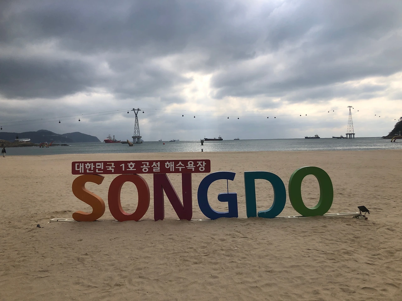 송도해수욕장의 끝에 송도오션파크가 있는데 이곳에 도착할 즈음에 해가 구름 속에서 나온다(8.0km, 10:20).
