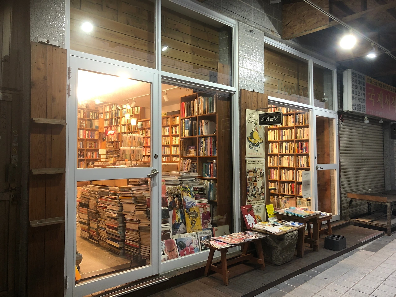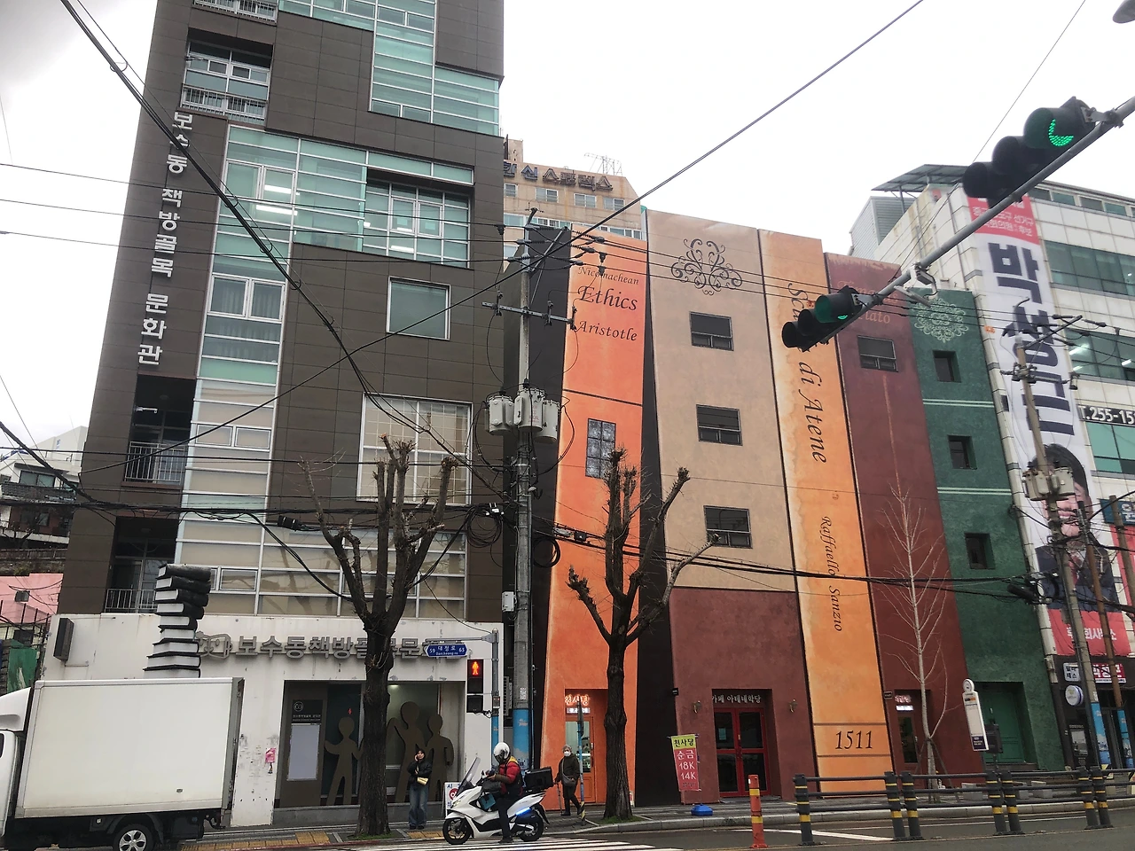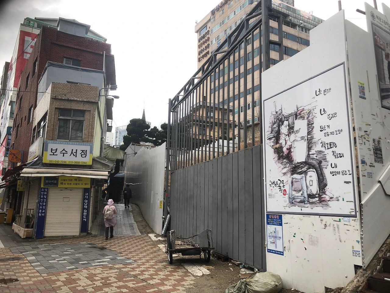부산근현대역사관에서 횡단보도를 건너 좌측으로 꺾어 대청로를 따라가면 보수동책방골목이 나온다(1.7km, 16:53). 아쉽게도 첫째, 셋째 화요일은 휴무여서 오늘은 책방골목이 쉬는 날이다. 딱 한 군데, 우리글방이 열려 있어서 안을 들여다본다. 책방골목은 작지만 책과 관련된 조형물들, 특히 거대한 책 모양의 외관을 하고 있는 건물 그리고 책방골목문화관이 있어서 나름 특색이 있다. 어린 시절 자주 다니던 대구 남산동의 헌책방 거리를 생각나게 한다.