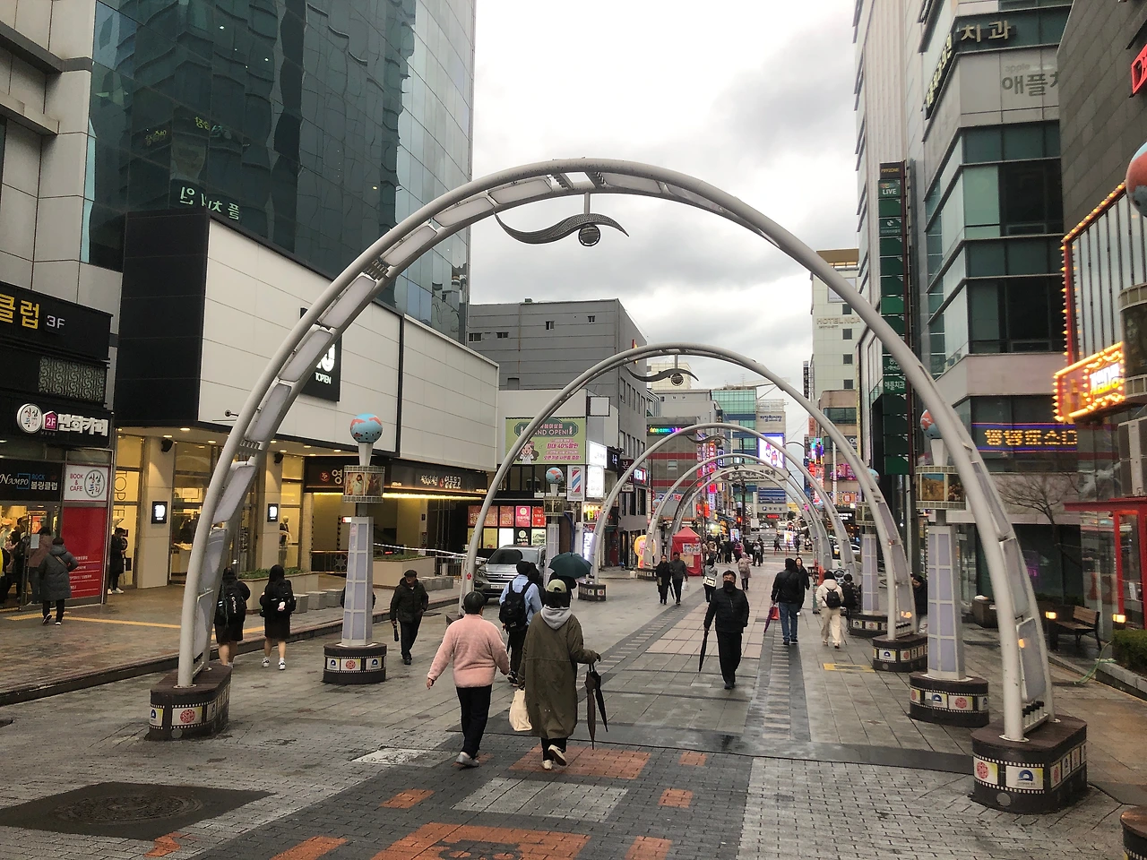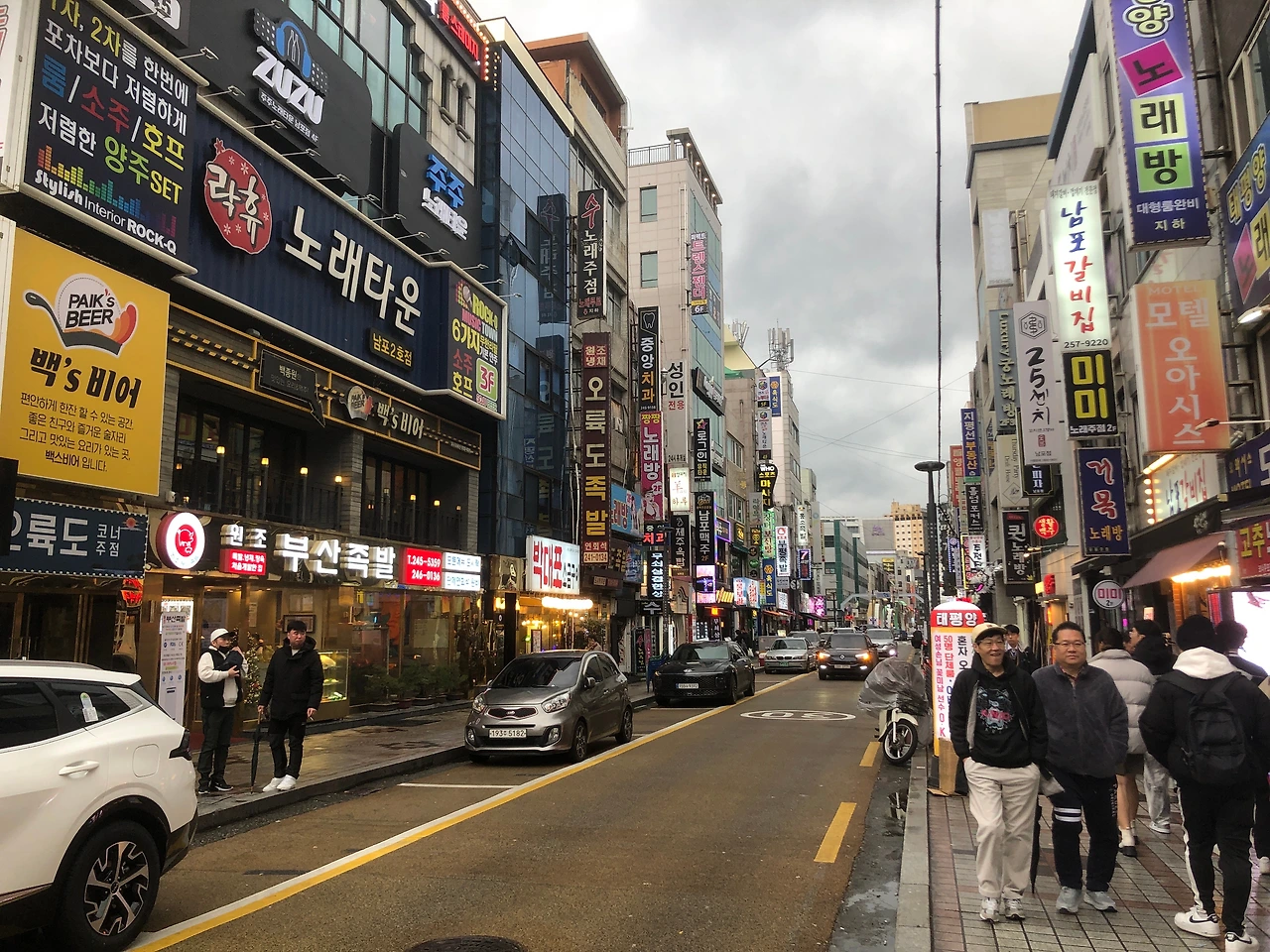 족발골목을 지나치면 국제시장 사거리가 나온다. 길을 걷는 방향의 왼쪽이 국제시장이다. 용두산공원에서 내려와서 책방골목, 깡통시장, 족발골목을 돌아서 오는 길은 국제시장을 중간에 두고 시장의 외곽으로 도는 길이다. 국제시장도 이전에 와봤기 때문에 그냥 통과한다. 조금 더 가다가 남파랑길 경로를 따라 우측으로 돌면 BIFF 광장이 나온다(2.9km, 17:20). BIFF 광장에는 중국인 단체 관광객들이 씨앗호떡을 사려고 우르르 몰려 있다.