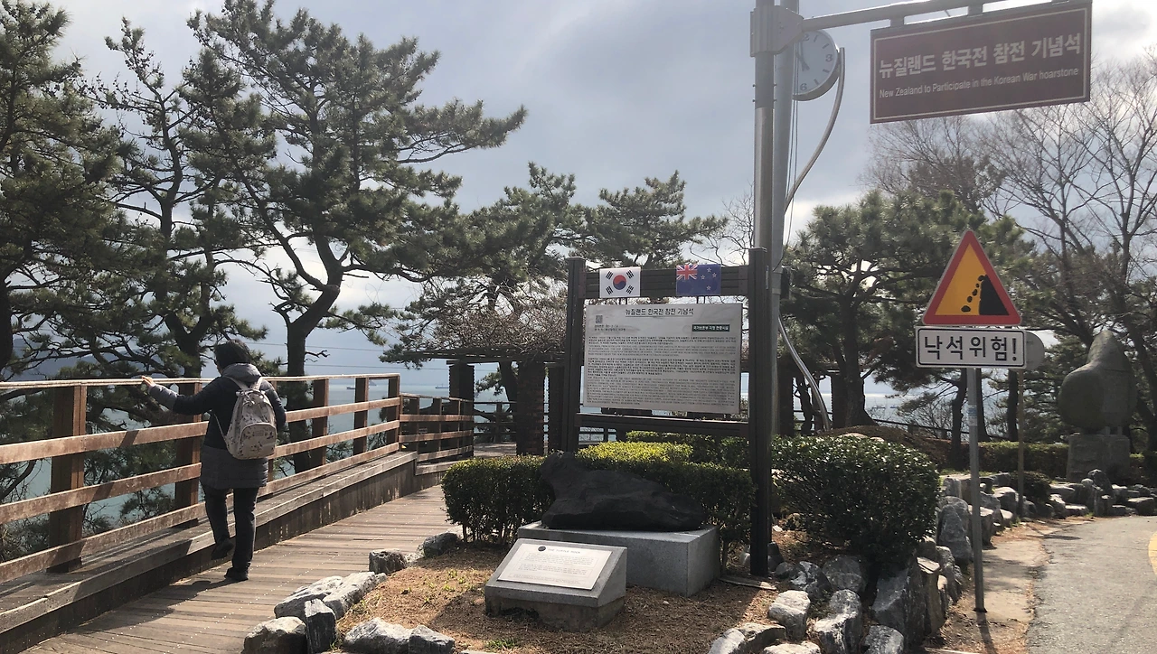 도로변으로는 대략 1km 정도를 가는데 대부분은 내리막이다. 가는 도중에 뉴질랜드 한국전 참전 기념석이 있는 소공원이 있다. (9.2km, 10:55)
