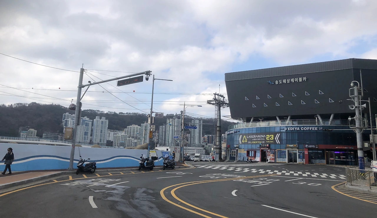 송도해변에서 가장 먼저 보이는 것은 해상케이블카 승강장이다(6.5km, 9:47). 해상케이블카는 여기서 출발해서 암남공원 내의 송도스카이파크까지 1.62km 거리를 연결하고 있다. 현재는 암남공원까지 가는 경로가 일부 대체 운영되고 있어서 케이블카를 이용하는 것도 권장할만하다. 우리는 사전에 그 사실을 알지 못해서 그냥 도보 경로를 택했다.
