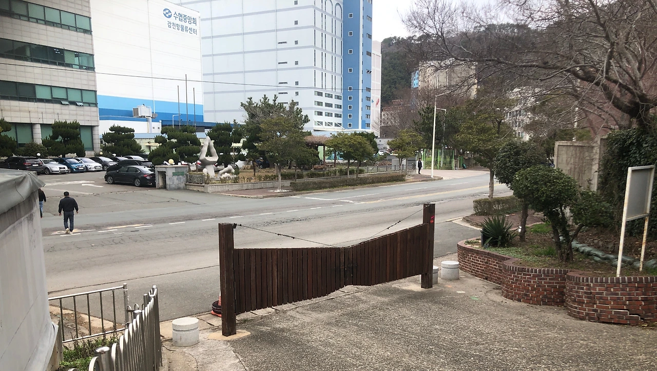여기는 임도가 끝나는 지점. 임도에서는 감천항이 내려다 보였는데, 이제 감천항이 가까워지는 위치로 가고 있는 모양이다. 암남공원 후문에서 지금까지 감천항 주변으로 보이던 풍경은 온통 냉동창고이고, 우리나라의 참치캔 제조회사가 모두 모여 있는 듯한 느낌이다. 하긴 내가 아는 참치회사 이름 중에서 빠진 회사는 없었던 것 같다.