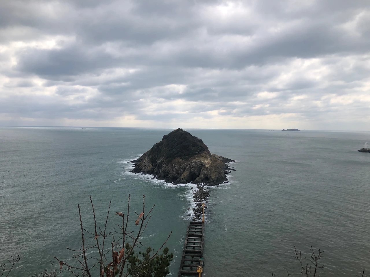 두도전망대에 도착했다(11.6km, 12:15). '대가리섬'이라니... 가만 보니 바다 위에서 사람 머리가 하나 쑥 올라온 듯한 느낌이 드는 것 같다. 아래에 보이는 철구조물은 아마도 길을 만드는 중인가 보다.