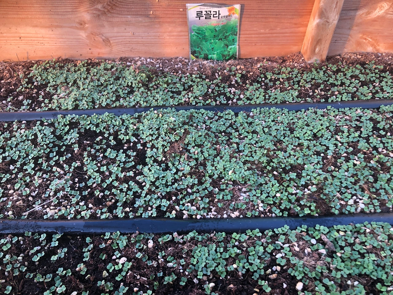 쌈채 3종(루꼴라, 어수리, 눈개승마)을 틀밭 하나를 1/3 정도로 나누어 흩뿌렸다. (3/3 일)