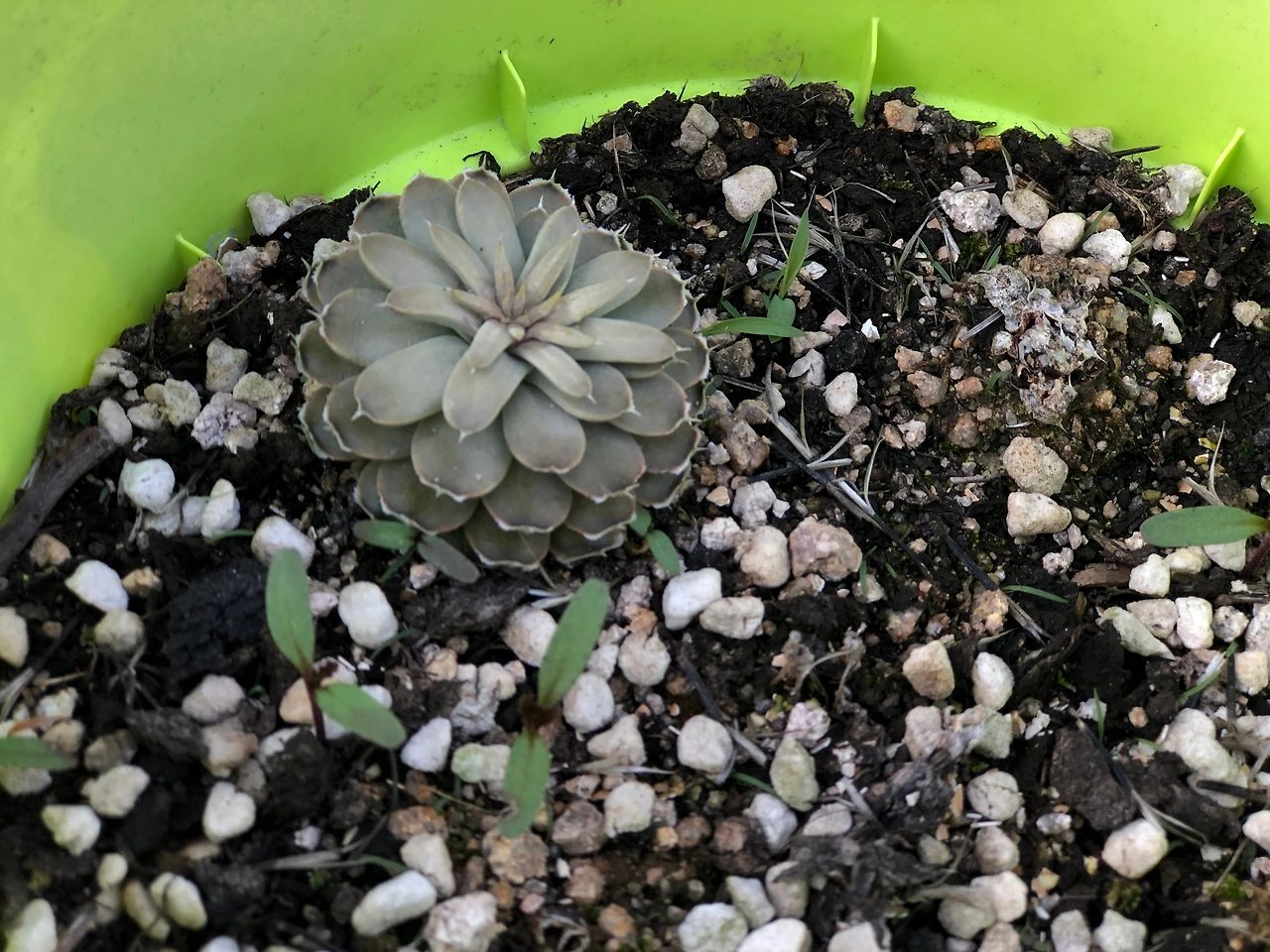 7. 와송이 자라던 화분에는 새로 와송이 올라오고 있다. 그 옆에 빠지지 않는 매리골드 새싹들.