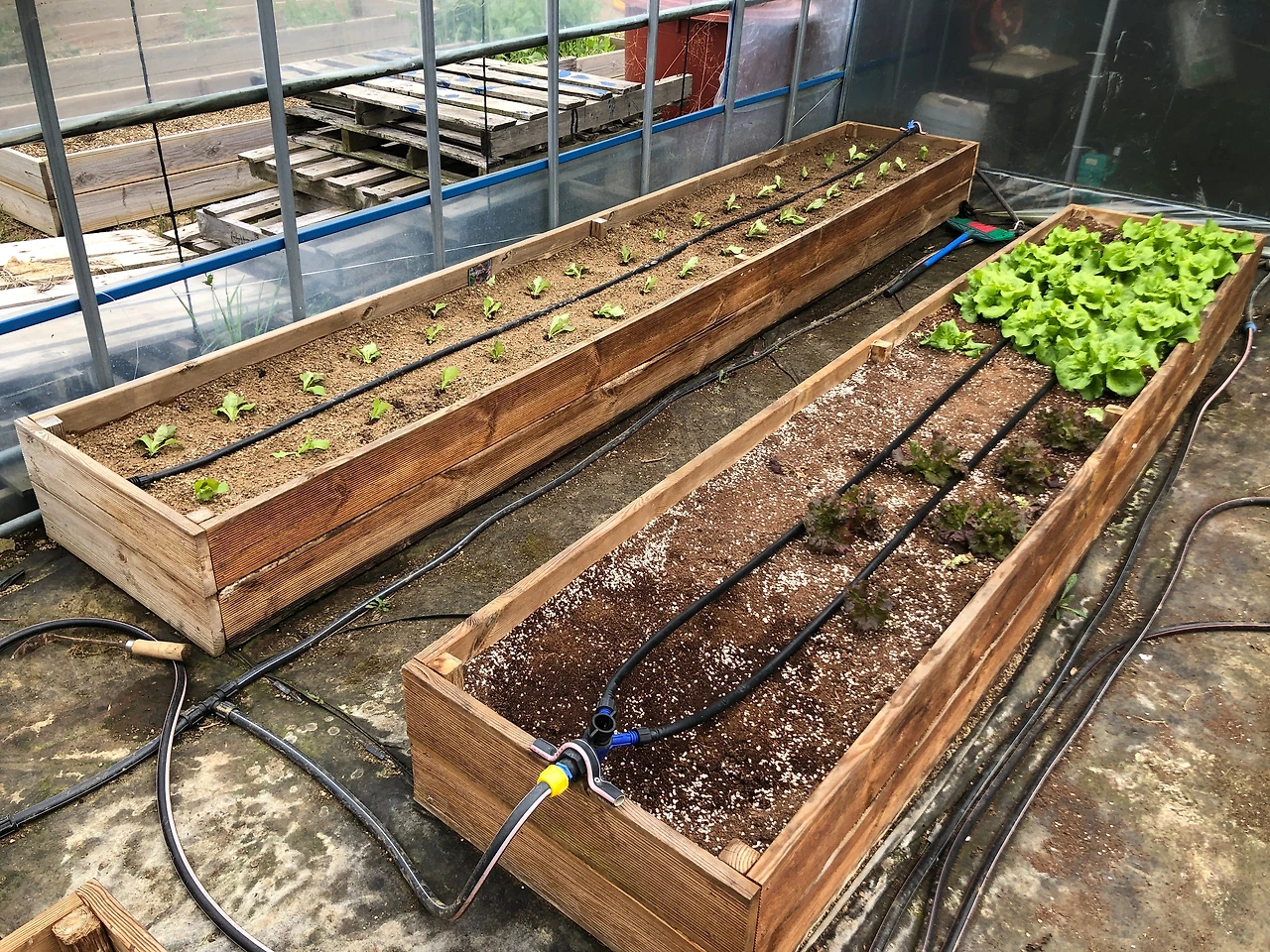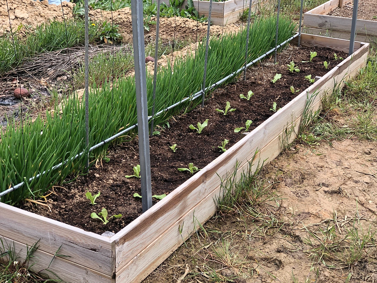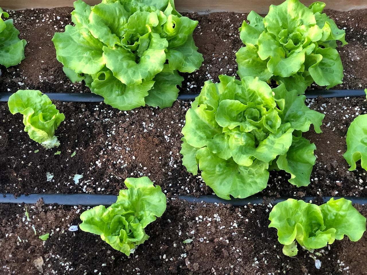 올봄에 파종을 한 상추는 모두 3가지이다. 꽃상추와 청치마상추는 3월 3일에 파종했고, 흑하랑은 그보다 늦은 3월 9일에 파종을 했는데 흑하랑이 더 빨리 자랐다. 올해는 가장 중요하게 재배를 할 채소 중의 하나가 흑하랑이어서 모판에 파종을 한 지 딱 한 달만인 4월 9일에 정식을 했다. 올해는 여러 가지 시도를 해보려는 차원에서 비닐하우스 안에는 틀밭을 하나 가득 채우고, 나머지는 바깥의 쪽파가 자라고 있는 틀밭의 한쪽을 가득 채웠다. 쪽파는 곧 일부를 수확하고 나머지는 다른 곳으로 이식을 할 예정이고, 그 자리에는 오이와 애호박을 심을 예정이어서 빈 공간으로 남는 안쪽에 흑하랑을 채웠다.