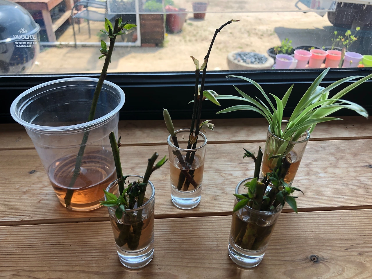 가지를 정리하면서 버리려던 장미와 목련 가지에서 이파리가 터져 나오는 것을 보고 잘라서 물에 꽂았다. 운 좋게 뿌리가 내릴 수도 있겠다는 기대를 가지고...