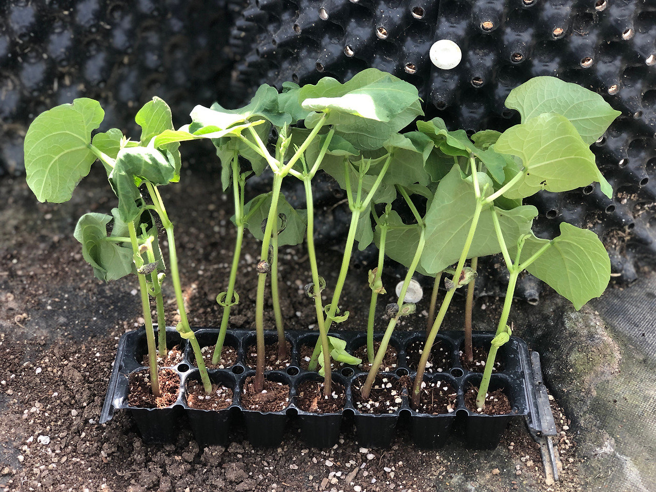 완두콩이나 강낭콩을 심어 보려 했는데 시기를 놓쳤다. 그래서 지금 적기라고 하는 호랑이콩을 몇 포기 샀다. 이건 비닐하우스 뒤쪽의 벽체에 망을 달아서 길러 보려고 한다.