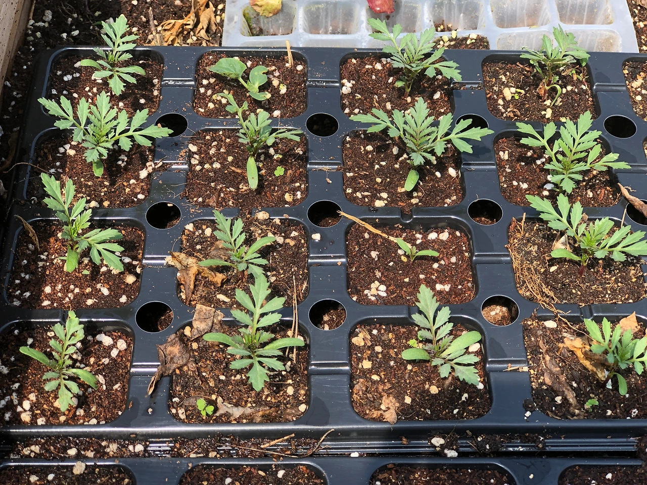 비닐하우스에서 올라온 매리골드 싹들은 제법 자라서 모종판에 옮겨 심었다. (3/14 일)