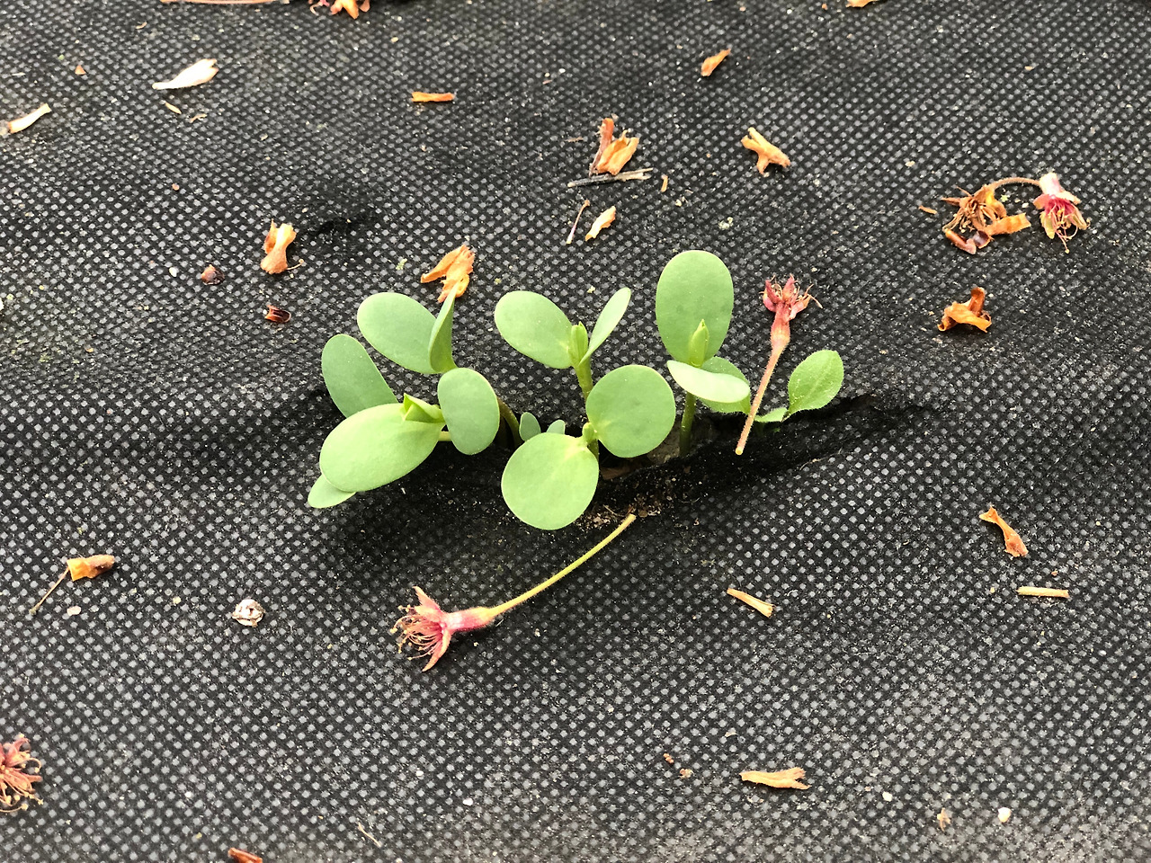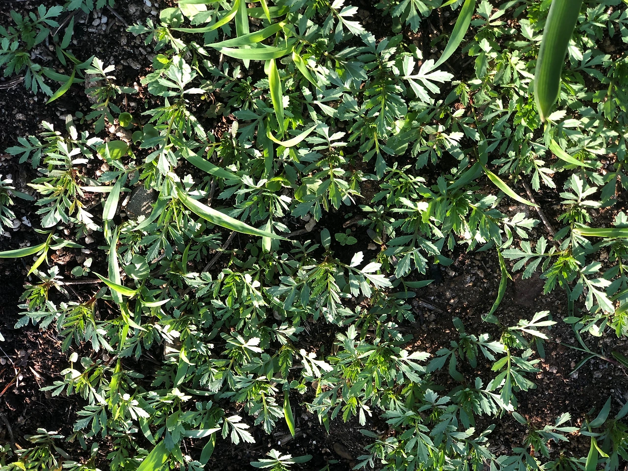 내가 무언가를 분명히 뿌리긴 했는데 무슨 씨앗인지 기억이 안 난다. 작년에 갈무리해 둔 꽃씨 중의 하나일 수도 있고, 남은 채소 씨앗일 수도 있는데 도무지 기억이 안 난다. 올해 씨앗을 뿌리거나 모종을 심은 것 중에 유일하게 기억이 나지 않는 한 가지이다. 싹이 올라오지 않을 수도 있어 기대감을 가지지 않고 그냥 흩뿌려 놓은 것이어서 기억이 안 나는 것 같다. 일단은 잎이 나고 모양새가 갖춰질 때까지 기다려 보기로 한다. 그런데, 지나치면서 이 어린싹들을 볼 때마다 궁금해서 미치겠다...ㅎㅎ