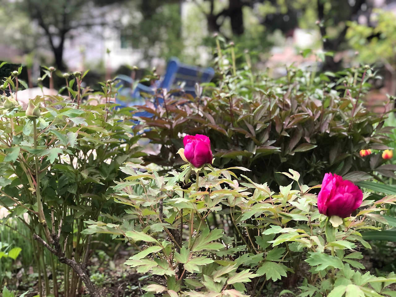 모란꽃이 피기 시작한다. 거름을 주지 않고 두었더니 작년까지 꽃봉오리 수가 줄어들었는데 올해에는 다시 늘어나긴 했는데, 아직 4개 정도밖에 보이질 않는다. 그중에서 두 개가 활짝 피었다. (4/19 금)