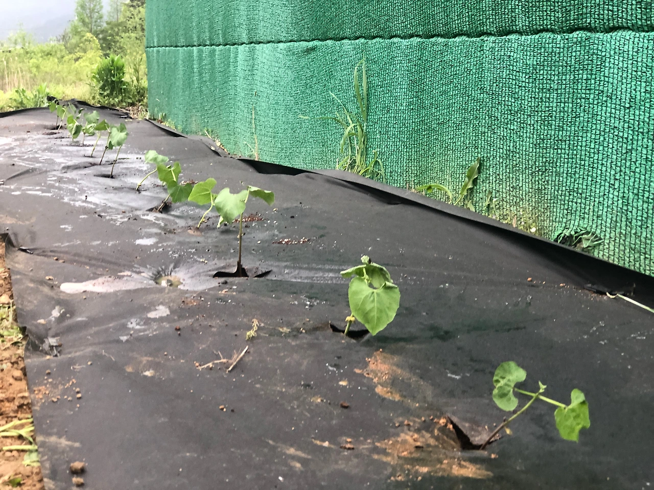 다음 날, 임시로 고정시켜 놓은 부직포 매트를 살짝 들어서 길게 고랑처럼 땅을 판 곳에 부드러운 흙을 넣은 후에 거름도 섞어 넣었다. 그리고 다시 부직포 매트를 덮고 고정을 시켰다. 모종을 심을 위치를 대충 정한 후에 매트를 십자로 오리고, 모종을 심을 구멍을 파고, 구멍에 물을 먼저 주었다. 오랜 시행착오를 거친 후에 얻은 요령이다. 모종을 심기 전에 물을 먼저 주고 모종을 심어야 모종이 잘 견딘다. 호랑이콩 모종을 심고서 토닥토닥 흙을 덮어주고 마무리했다. 이젠 주문해 놓은 양계망이 오면 그걸로 콩이 타고 올라가도록 해주면 끝이다. (4/20 토)