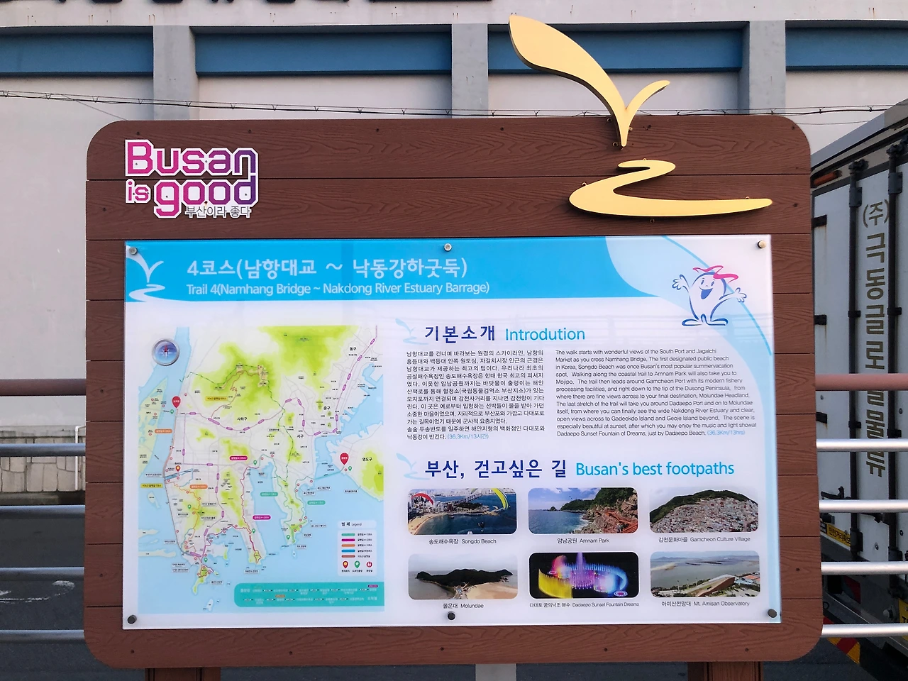 감천나누리파크 - 감천항(1.1km) - 구평동 산길(2.7km) - 두송반도 회귀점(5.2km) - 두송방파제(6.2km) - 다대포항(7.5km) - 다대포생선회먹거리타운(9.1km) - 몰운대 전망대/남단(11.3km) - 다대포해변(12.3km) - 아미산전망대 앞 횡단보도(13.5km) - 아미산 전망대(14.5km) - 아미산 등산로 입구(15.4km) - 아미산 전망대(16.6km) - 현대요양병원 앞(19.7km) - 장림생태공원(20.2km) - 장림유수지(20.9km) - 선셋전망대(21.6km) - 을숙도대교 아래(22.5km) - 신평동교차로(23.9km)