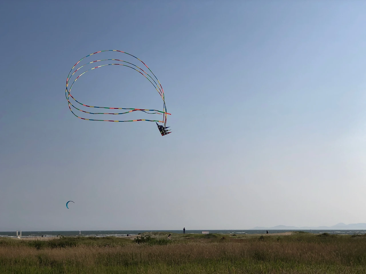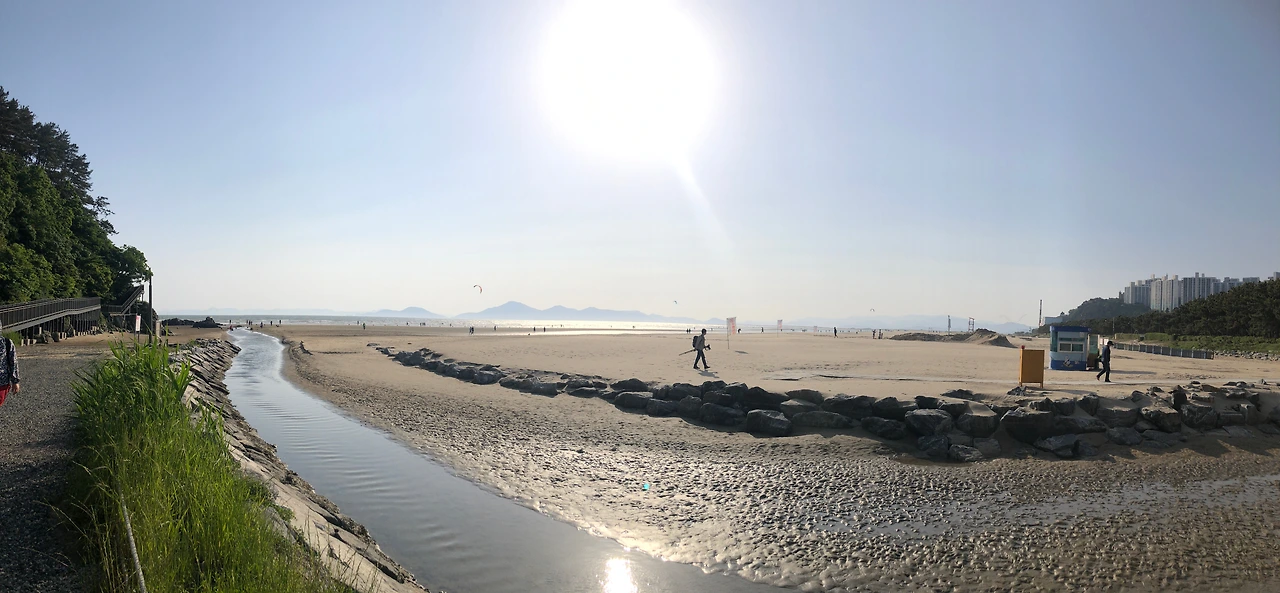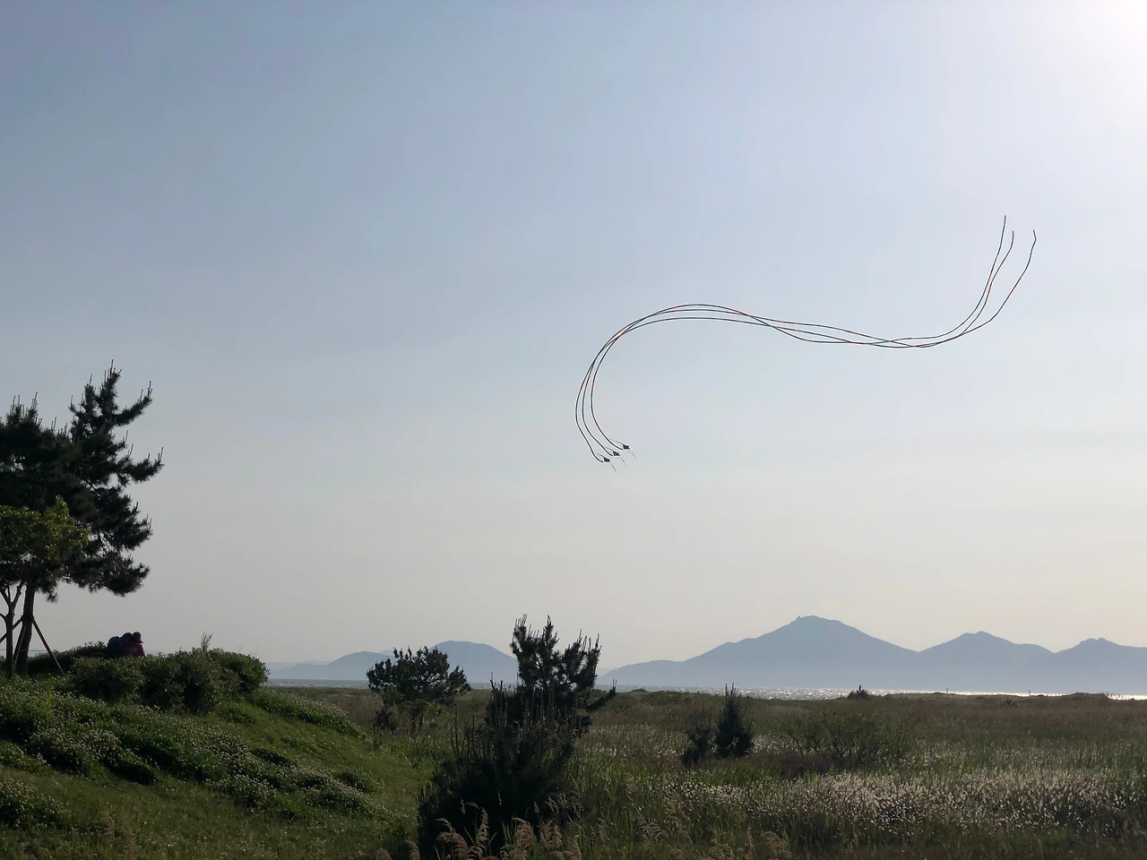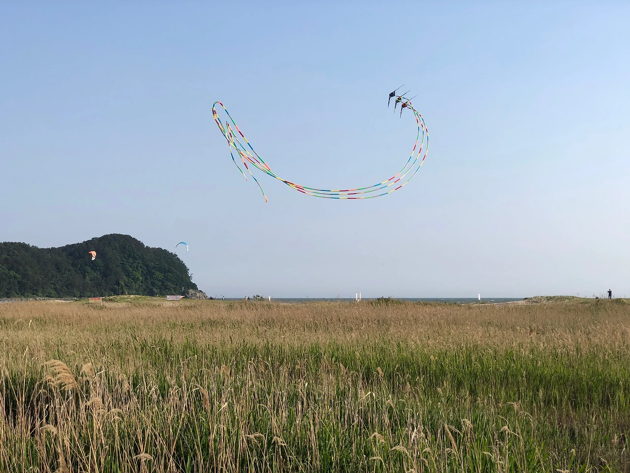 해솔길의 전반부에서 이 세 나무를 보면서 지나오다 보면 갈대밭을 만나게 된다. 마치 순천만의 갈대밭에 온 것처럼 무성하게 자라는 갈대밭이 보기 좋은 구간이다. 여기서도 어딘가에서 해당화의 향기가 풍겨온다. 갈대밭 저 너머에서 드론으로 조정하는 듯한 연이 하늘을 나는 모습을 보면서 가다 보니 길이 즐겁게 느껴진다.