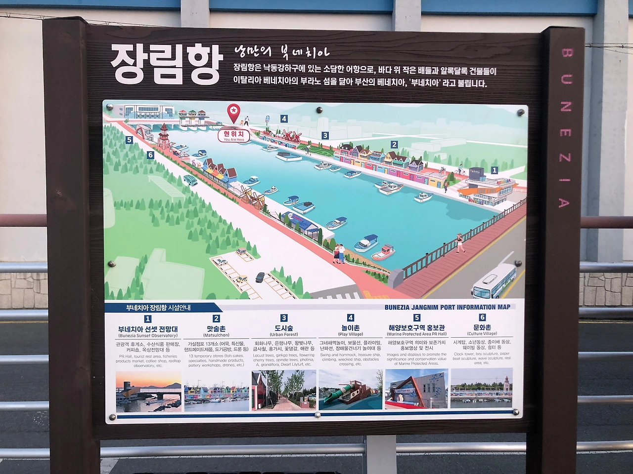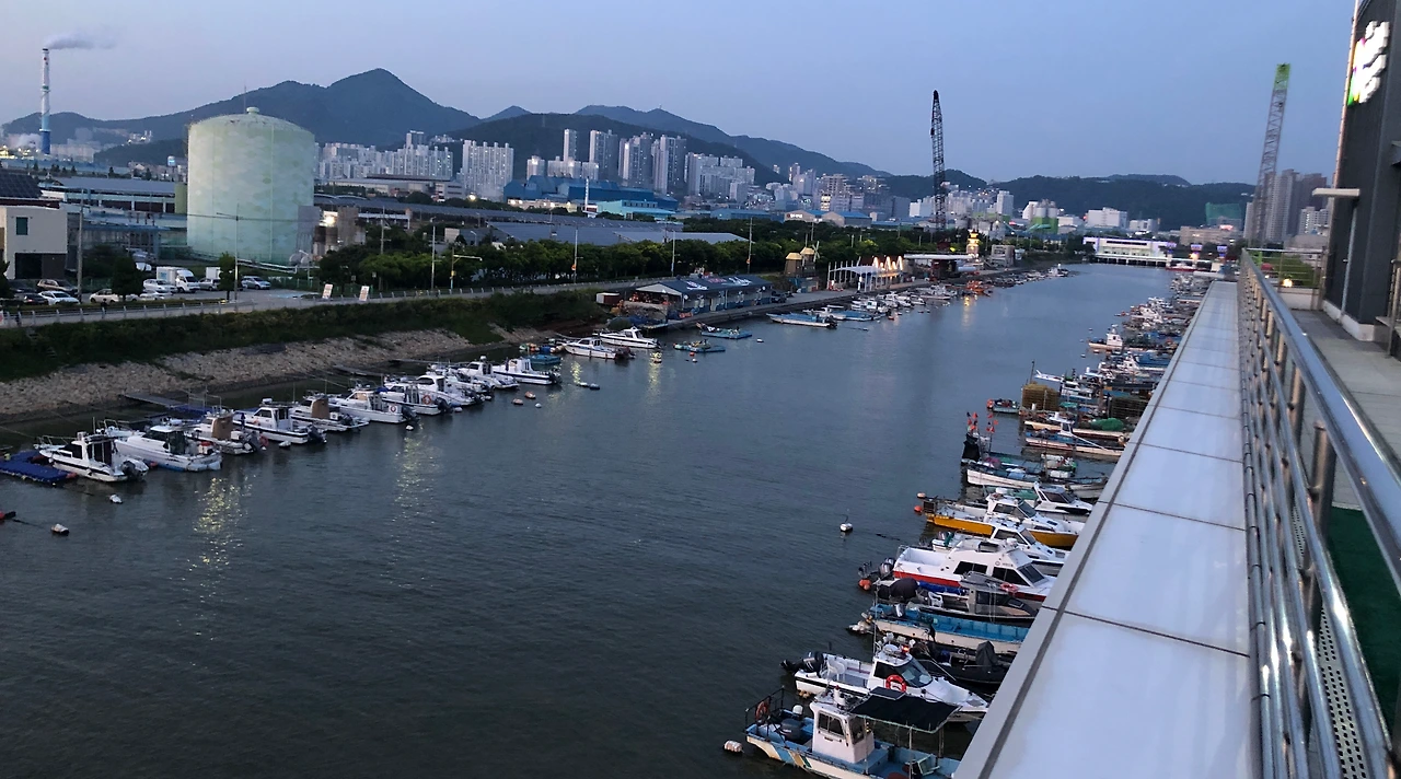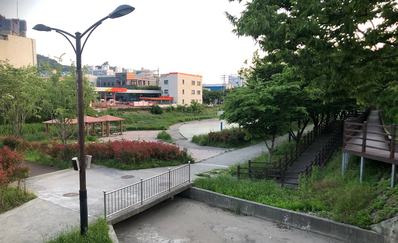 장림유수지를 통과하면서 건너편 길로 넘어간다. 유수지는 집중호우가 있는 홍수기에 물을 저장해서 홍수 피해를 막고, 그 물을 갈수기에 사용하기도 하는 용도로 만든 시설이다. 주변 공단의 오염된 물이 다량으로 유입되면서 악취가 많이 나면서 기피시설이 되었던 적이 있어 지금은 생태공원으로 변신을 시켰다. 장림유수지의 다리를 건너면서 바다 쪽으로 보이는 장림포구를 조망한다. (19:15, 20.9km)