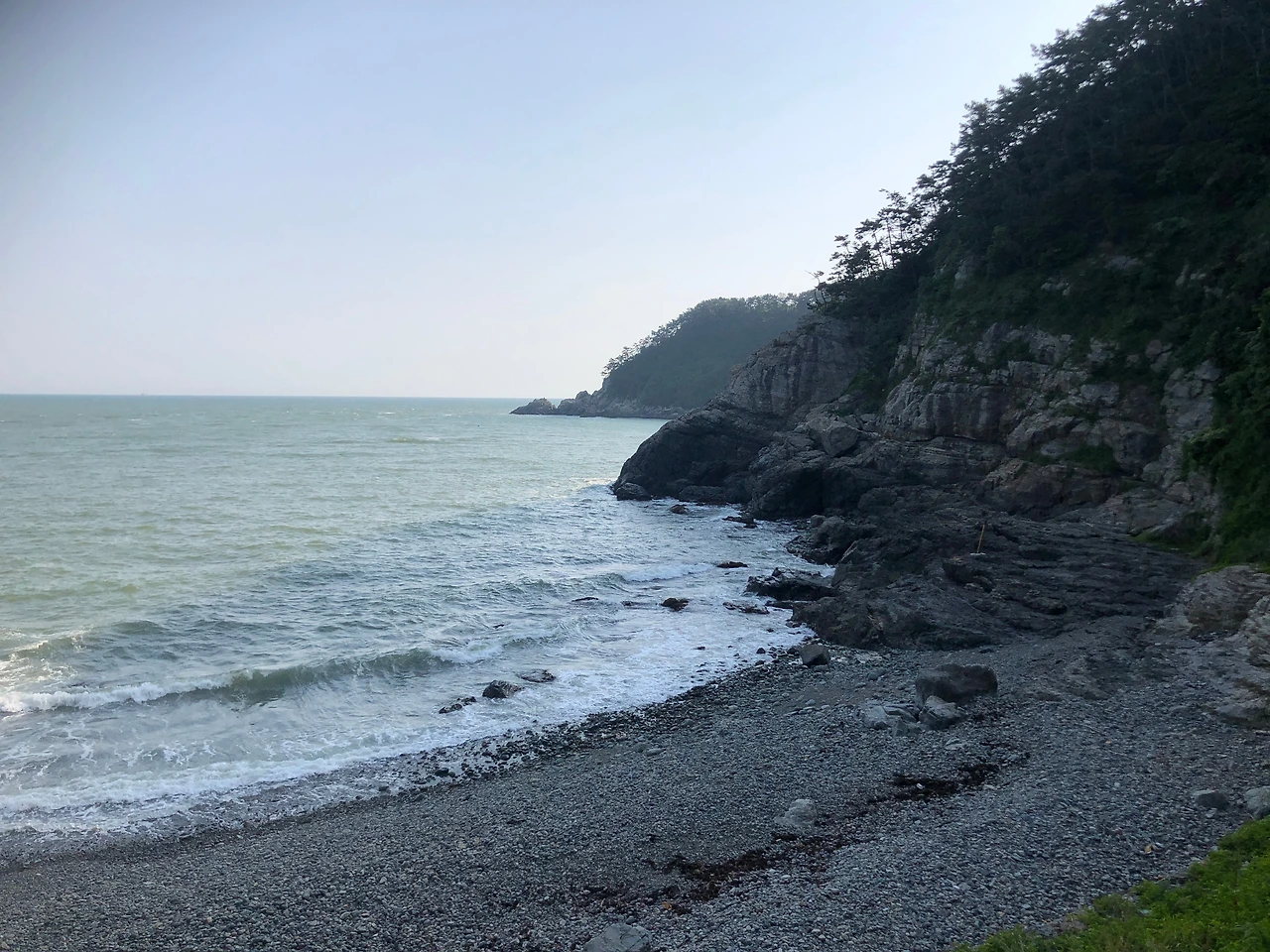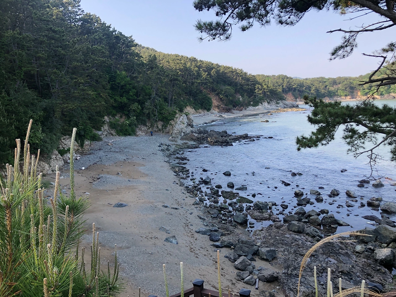 살짝 땀이 나는 이마를 식히려 모자를 벗어도 되는 그늘길로 들어서면 숲 속에서 철 지난 아카시아향이 묻어 나온다. 남쪽 바다여서 이미 아카시아꽃들은 져서 바닥에 널려 있는데 아직도 향이 남아 간간히 바람에 실려온다. 아주 작게 바다로 튀어나온 모양인 두송반도로 들어서는 길임을 알리는 안내판이 있고, 살짝 내리막길이 이어진다. (14:40, 4.9km)