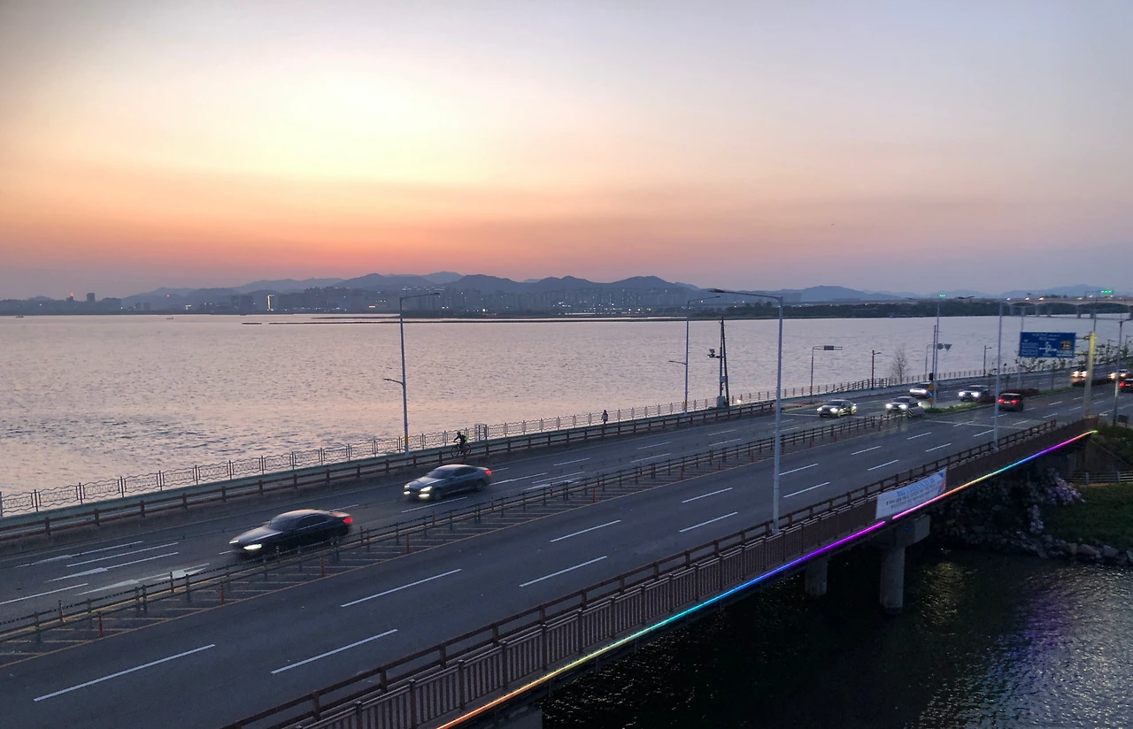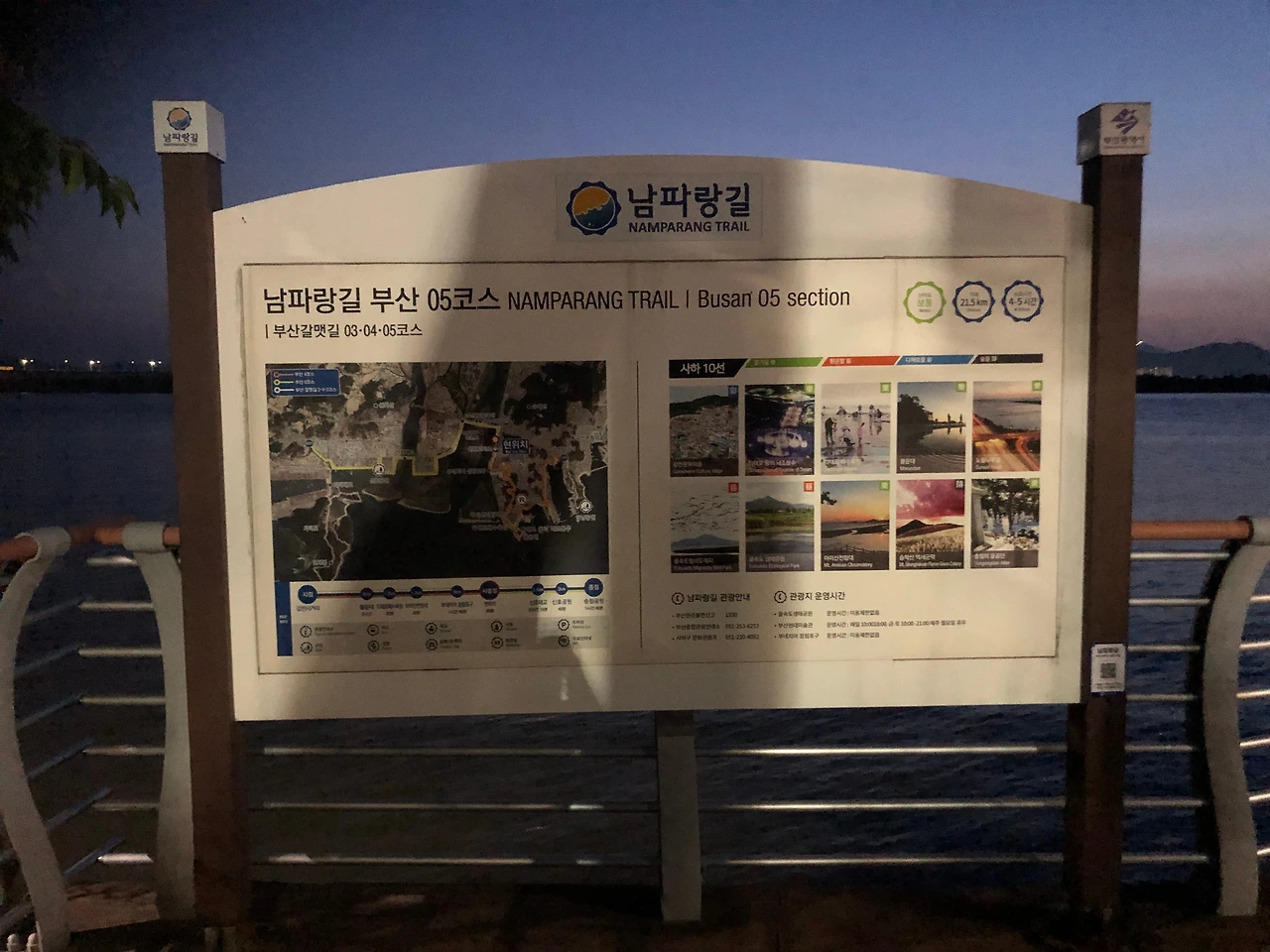 을숙도대교 아래에서 횡단보도를 건너서 바닷가 산책로로 넘어간다. 어두워서 안내 표시를 못 본 탓에 차도 옆의 자전거도로로 걸었다. 그러다가 인도는 아래쪽의 바닷가 길이 있다는 것을 늦게 발견했다. 늦은 시간, 가끔 전조등이 없는 자전거들이 나타나서 깜짝 놀라기도 했다. 그러니 인도로 걸었어야 하는데, 지도에만 의존해서 가다 보니 그걸 놓쳤다. 종료 지점인 신평동 교차로에 거의 다 와서야 그 사실을 알게 되니... (19:40, 22.5km)