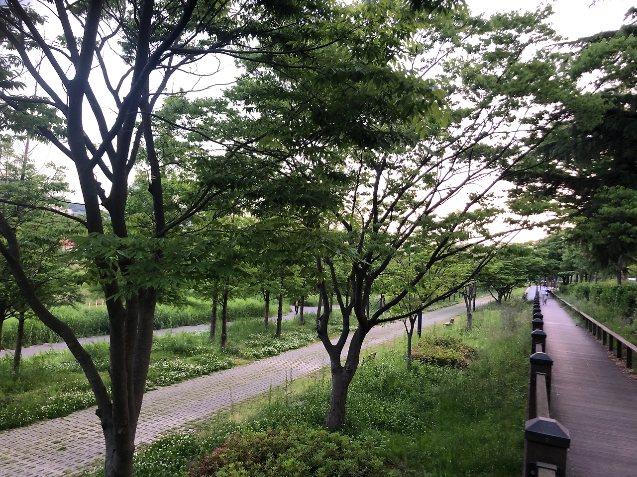 현대요양병원에서 대로를 만나면서 좌회전을 해서 대로변을 약 500m 정도를 걸어 장림 2교를 건너면 좌측 아래로 장림생태공원이 시작된다. (19:10, 20.2km) 장림생태공원은 유수지에 약 700m 정도의 산책로 수준으로 조성되어 있어서 산책을 하는 이들이 제법 있는 정도이다.