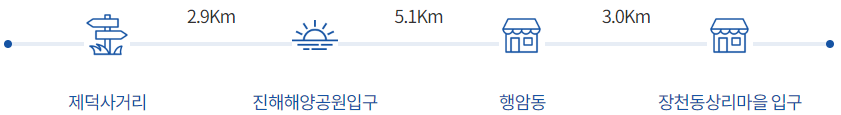 제덕사거리 - 제덕항(0.6km) - 삼포로 가는 길 노래비(1.6km) - 삼포마을 입구(2.1km) - 명동마을/진해해양공원 입구(2.9km) - 명동마을 끝단(3.8km) - K조선 정문(4.8km) - K조선기술훈련원(6.9km) - 행암동 해변(8.0km) - 창천동 사거리(10.0km) - 창천동 상리마을 버스정류장 (11.1km)