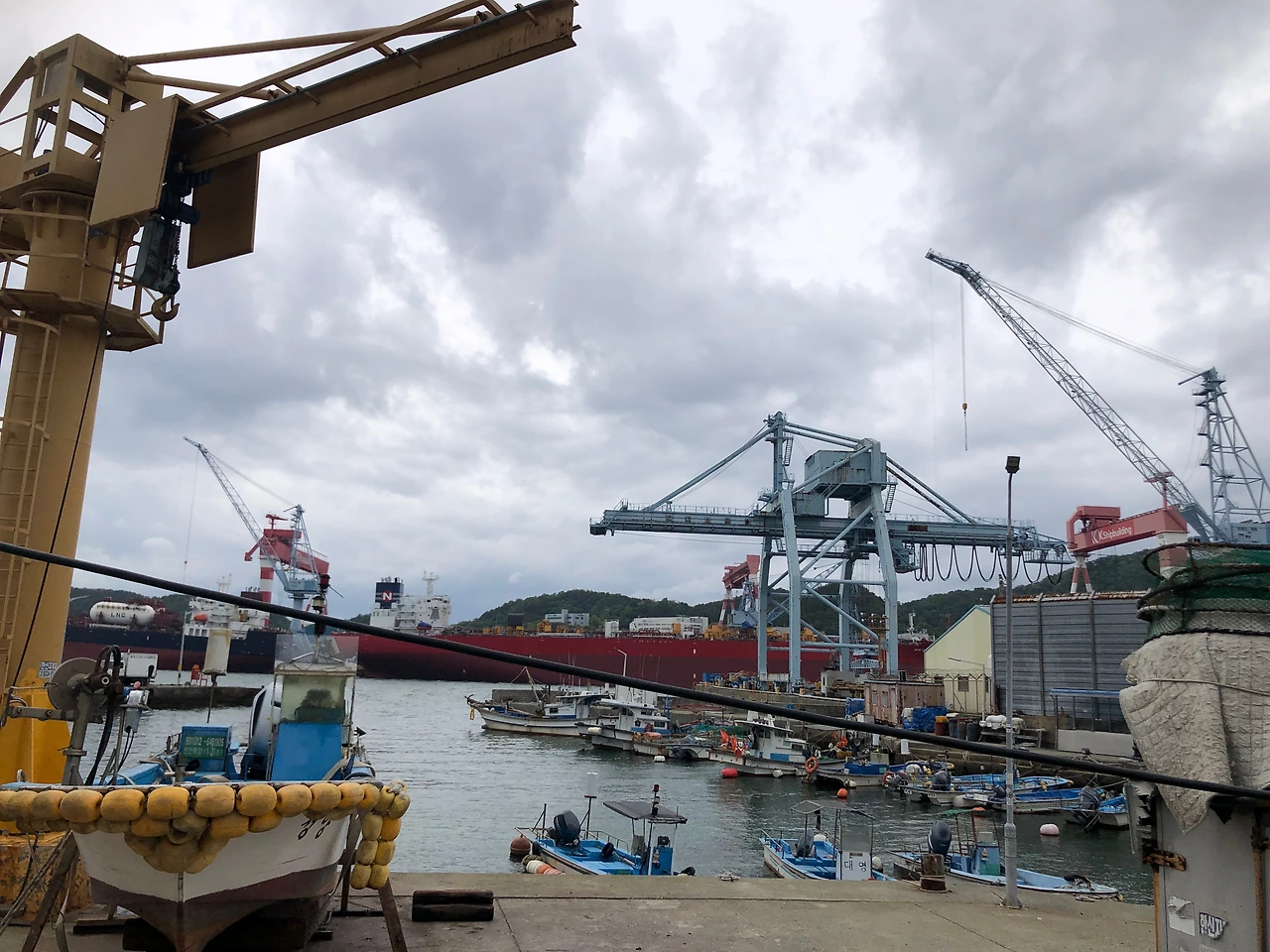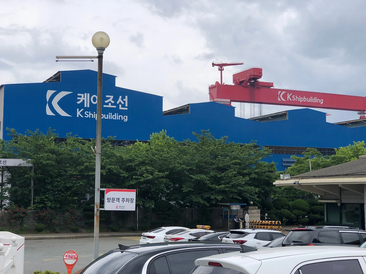 도로를 벗어나 조선소가 있는 안쪽길로 들어서면 주변엔 온통 조선과 관련된 산업체가 있어서 많이 시끄럽다. 그러고 보니 저 쪽 바다에 엄청 큰 화물선이 보인다. 제법 큰 규모의 조선소가 있는 모양이라고 생각하면서 약 1km 정도를 걸어가니 K조선 정문이 나온다. 'K조선'이라는 회사 이름은 처음 들어본다. (13:47, 4.8km)